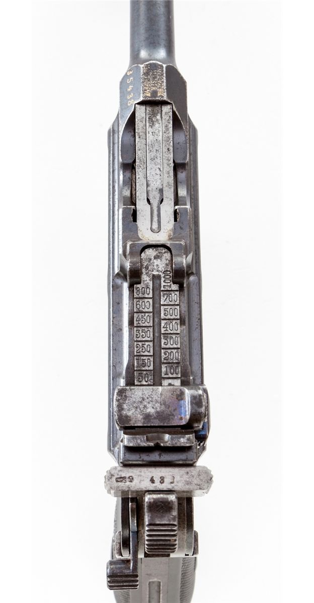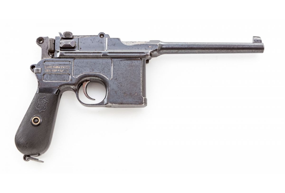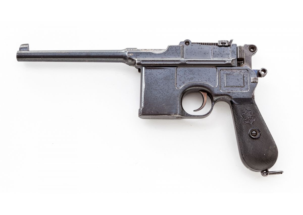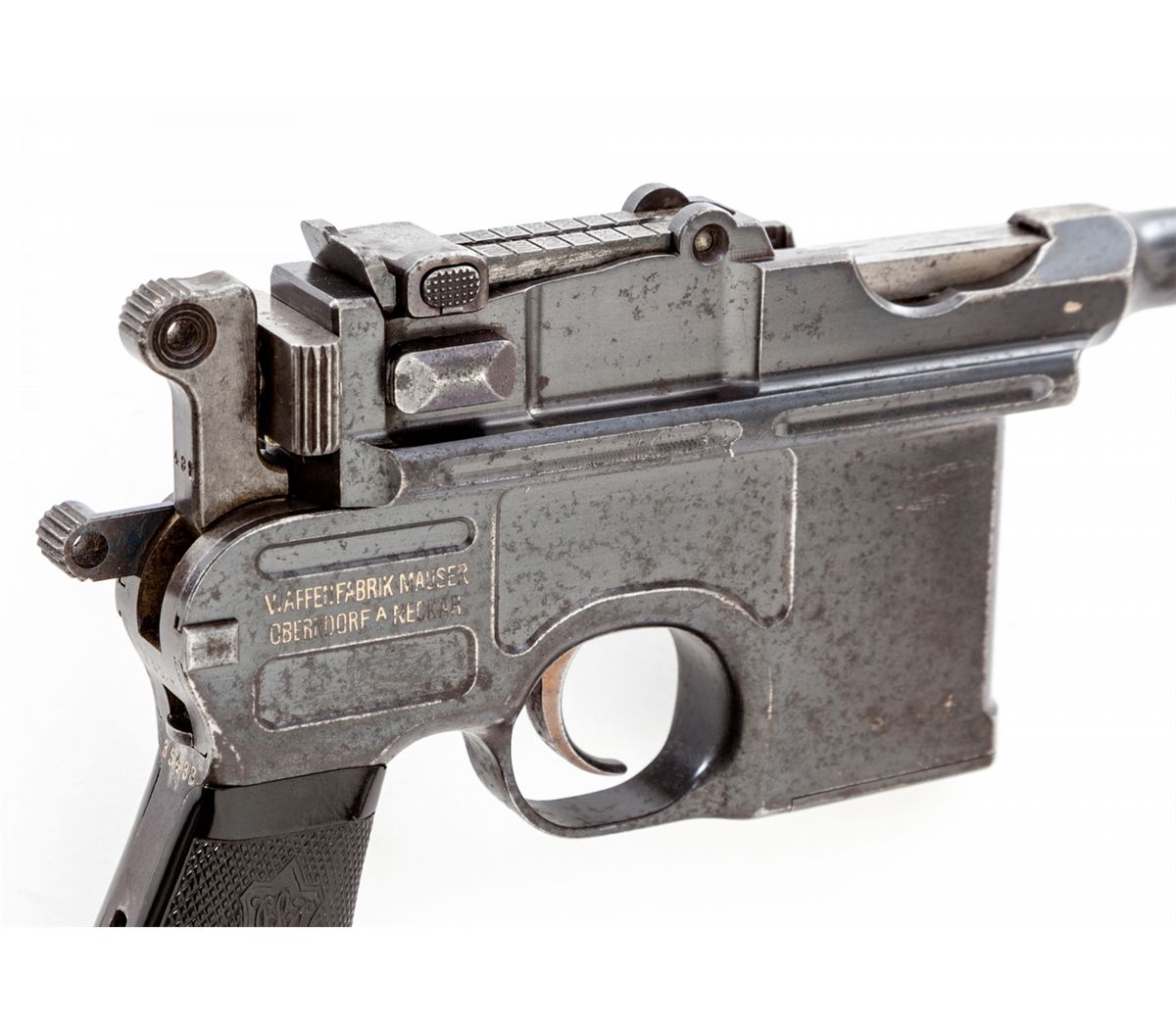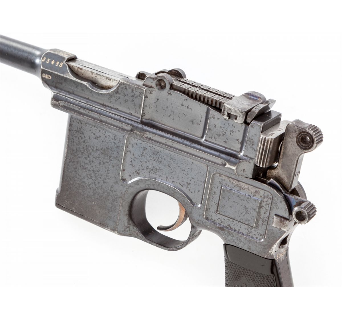 Early Small Hammer C-96 Broomhandle Semi-Automatic Pistol, #35438, 7.63mm Mauser cal., 5,5'' barrel, blue finish, factory checkered hard rubber grips, with sights calibrated 50-1000. One of the first Model 1896s to incorporate the small hammer, late safety, and two-lug firing pin, with early long extractor. Condition is about fine with light general thinning to finish and minor discoloration. Grips are crisp, bolt with some carbon spotting, bore is fine with very light frosting in grooves. A great early Small Ring. Est.: $1,200-$1,800. (C&R)