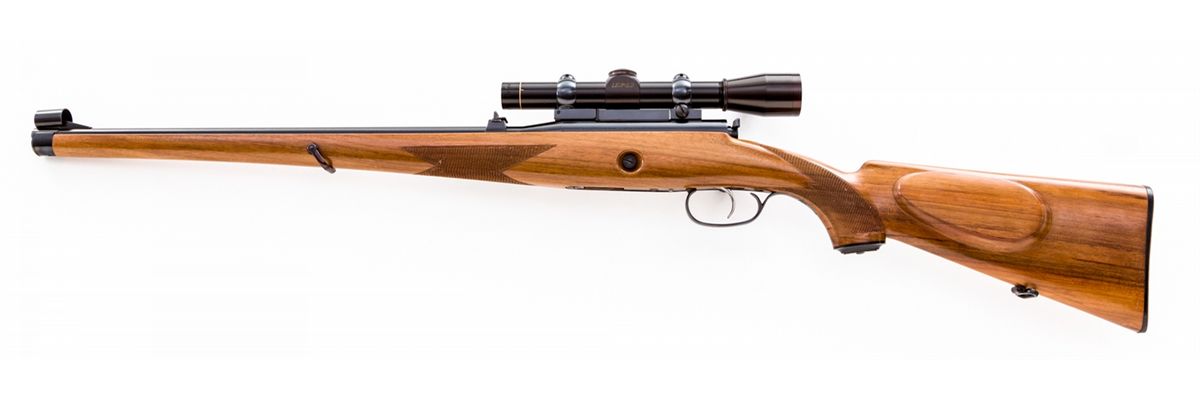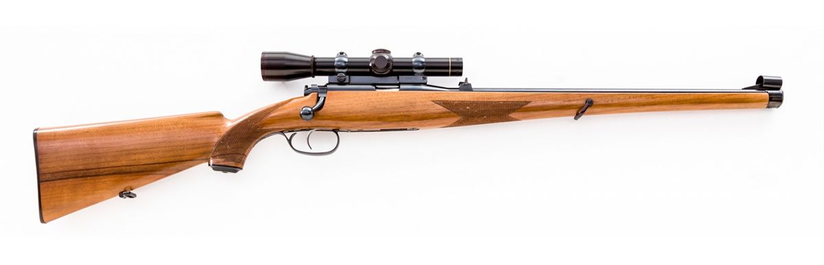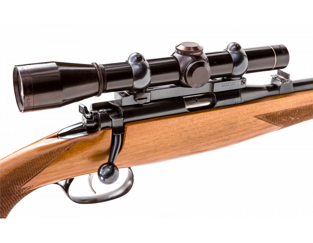 Early Steyr Zephyr Bolt Action Rifle, #15, .22 LR cal., 20'' barrel, blue finish, factory checkered European Mannlicher stock, with single non-adjustable trigger. Topped with a Leupold M8-3x scope on Buehler rings and mounts. Dated 1953. Condition is excellent showing just light marks from handling. Est.: $800-$1,200. (C&R) (Ernest A. Bryant III estate)