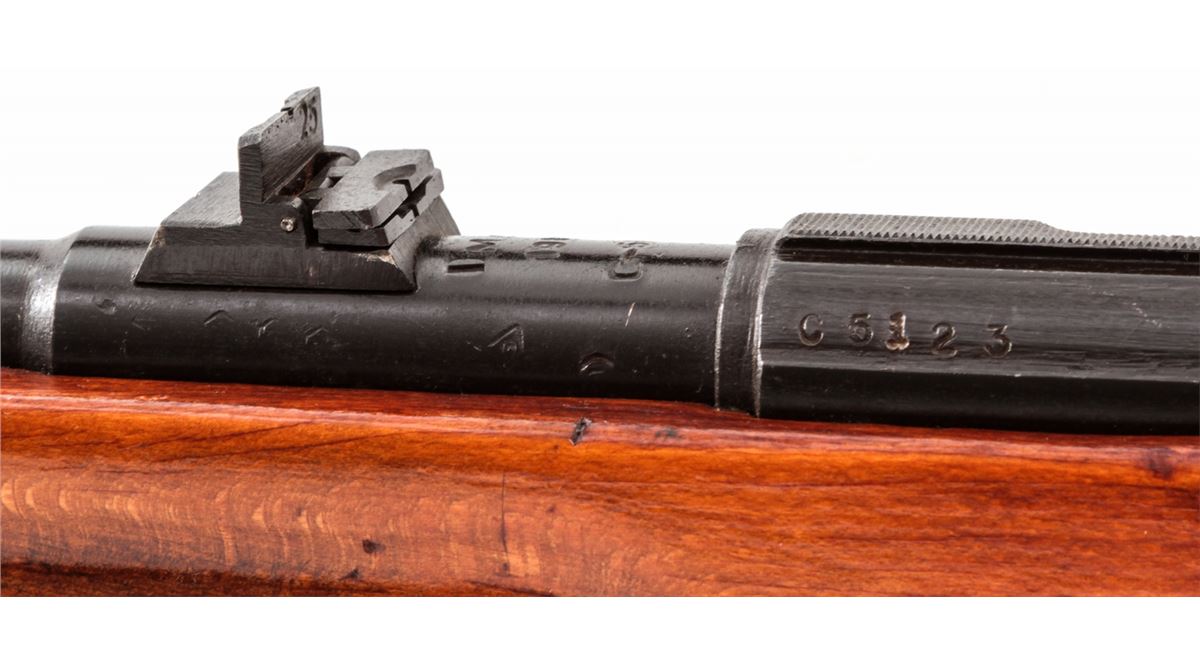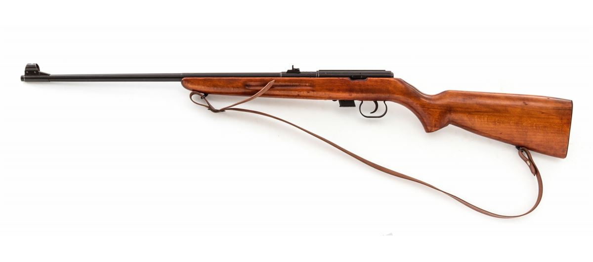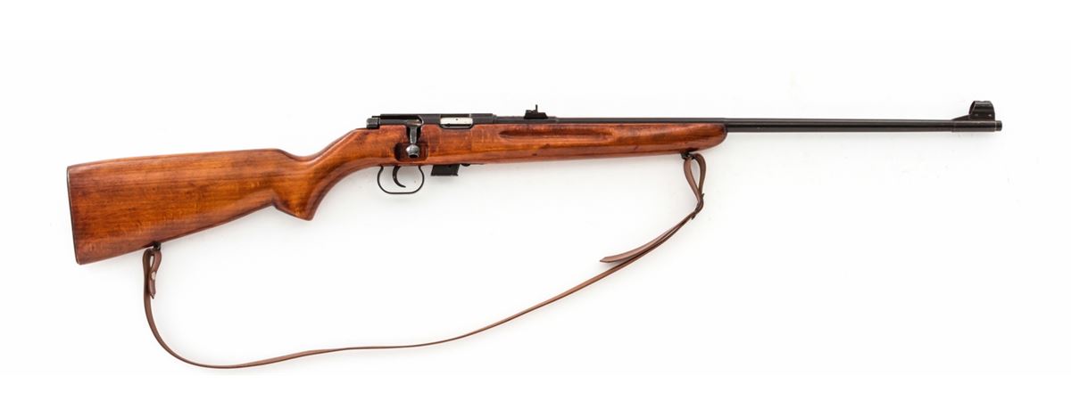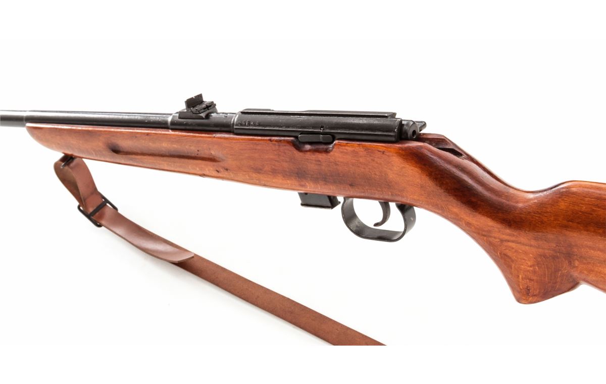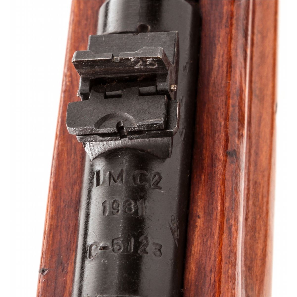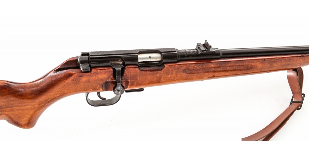 Eastern European Bolt Action Training Rifle, #C5123, .22 LR cal., 23'' barrel, blue/black finish, beechwood stock, with one 5-round magazine and leather sling. Chamber area marked ''IMC2/1981''. Possibly of Romanian mfg. Condition is fine showing light general use with minor importation marks to barrel. Good action and bore. Est.: $75-$150. (Modern)