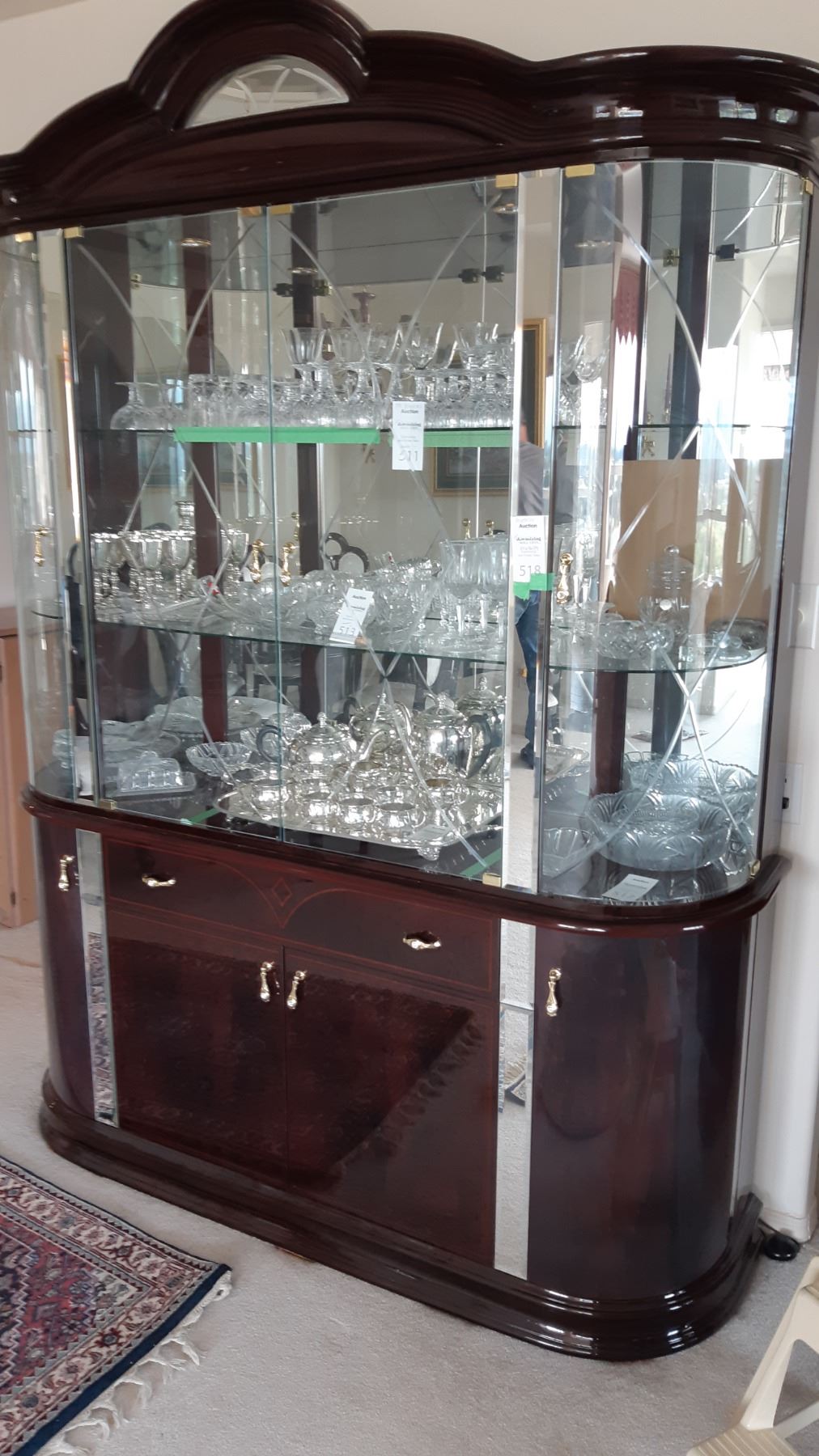 China cabinet with in lay detail and lacquer finish, made in Italy by Eddi Rose. Built in lighting, two pieces. 64x18x84. Heavy, bring help to carry and appropriate transport. Pick up 11-12