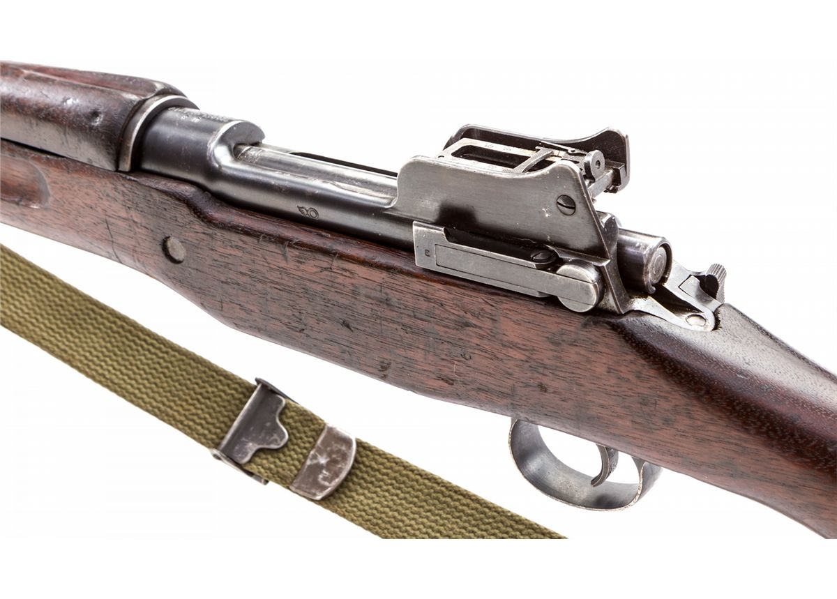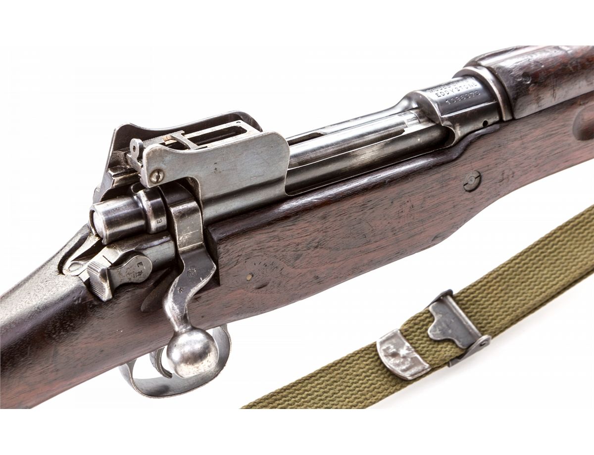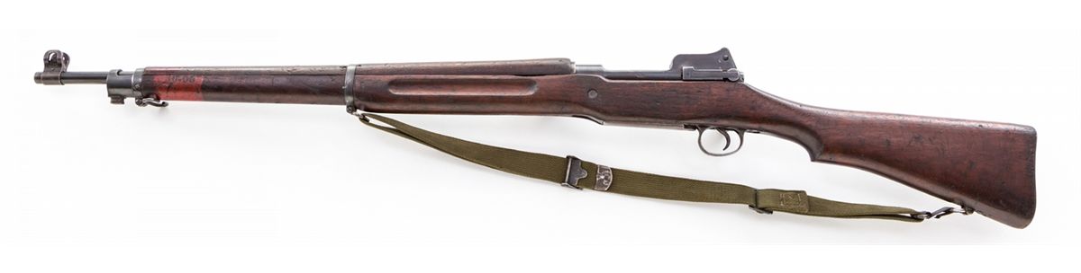 U.S. Model of 1917 Bolt Action Rifle, by Eddystone, #1096373, .30-06 cal., 26'' barrel marked ''E/9-18'', blue finish, walnut stock, with WWII era canvas sling. Condition is very good and still retaining approx. 94% of its original blue finish. Red striped stock indicates WWII era shipment to England but may be from a different rifle, as stock shows broadarrow proofs, but receiver and barrel are not similarly marked. Stock with oil darkening, light scratches, and small loss above fingergroove on left side; tip of stock is marked ''R''. Action remains good, bore is fine to excellent. Est.: $500-$750. (C&R)