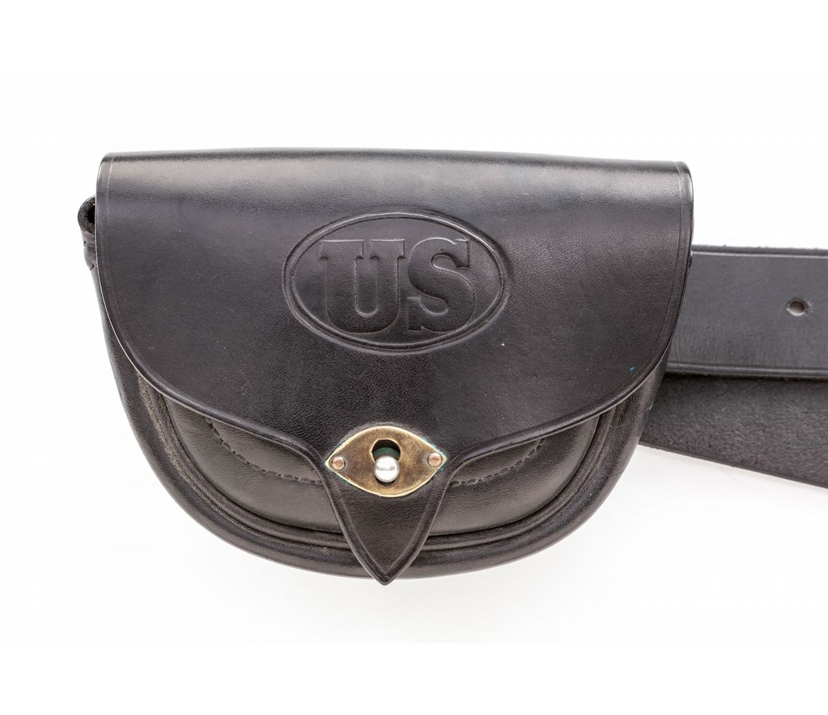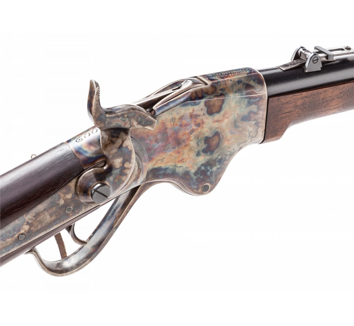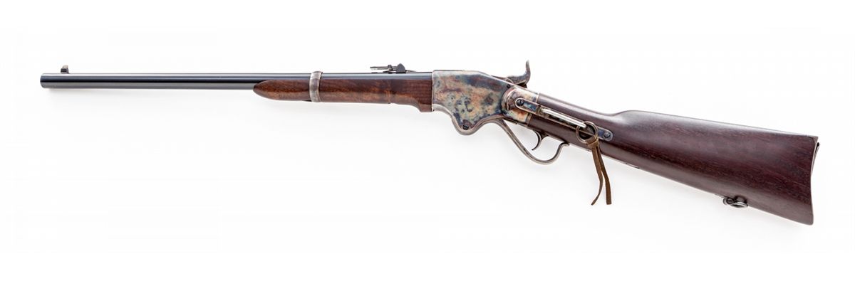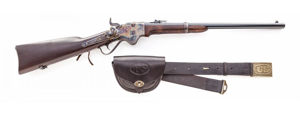 Fine American Made Copy of Spencer Carbine, by El Romano Rifle Co., Pennellville, NY, #10009, .56-50 Spencer CF cal., 22'' blue barrel, 7-shot magazine, case hardened frame, lever and hammer; walnut stock and forend. Adjustable ladder type rear and German silver blade front sights. Complete with black leather belt, U.S. marked pouch, and 35 once-fired brass .56-50 cartridges. According to El Romano Rifle Co., some 50 manufacturers from around the world have unsuccessfully attempted to reproduce this firearm. The El Romano Rifle Co. stands alone as the only company to successfully produce a flawless 1860 Spencer repeating firearms with superb quality and accuracy, and retailing at over $5,100. Condition is excellent showing only the slightest use. El Paso Saddlery pouch and belt are also excellent. This rifle is truly a quality piece of workmanship and is probably the ninth one mfg'd by the El Romano Co. Est.: $3,500-$5,000. (Antique)
