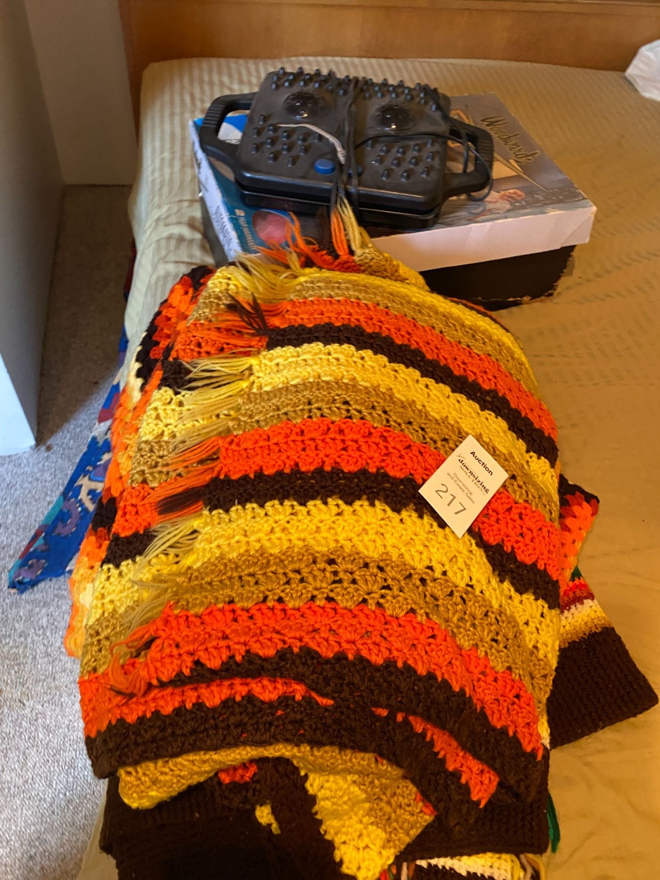 Electric blanket in vintage box from Woodwards, 3 crocheted blankets, foot massager, untested. Pick up 9-10