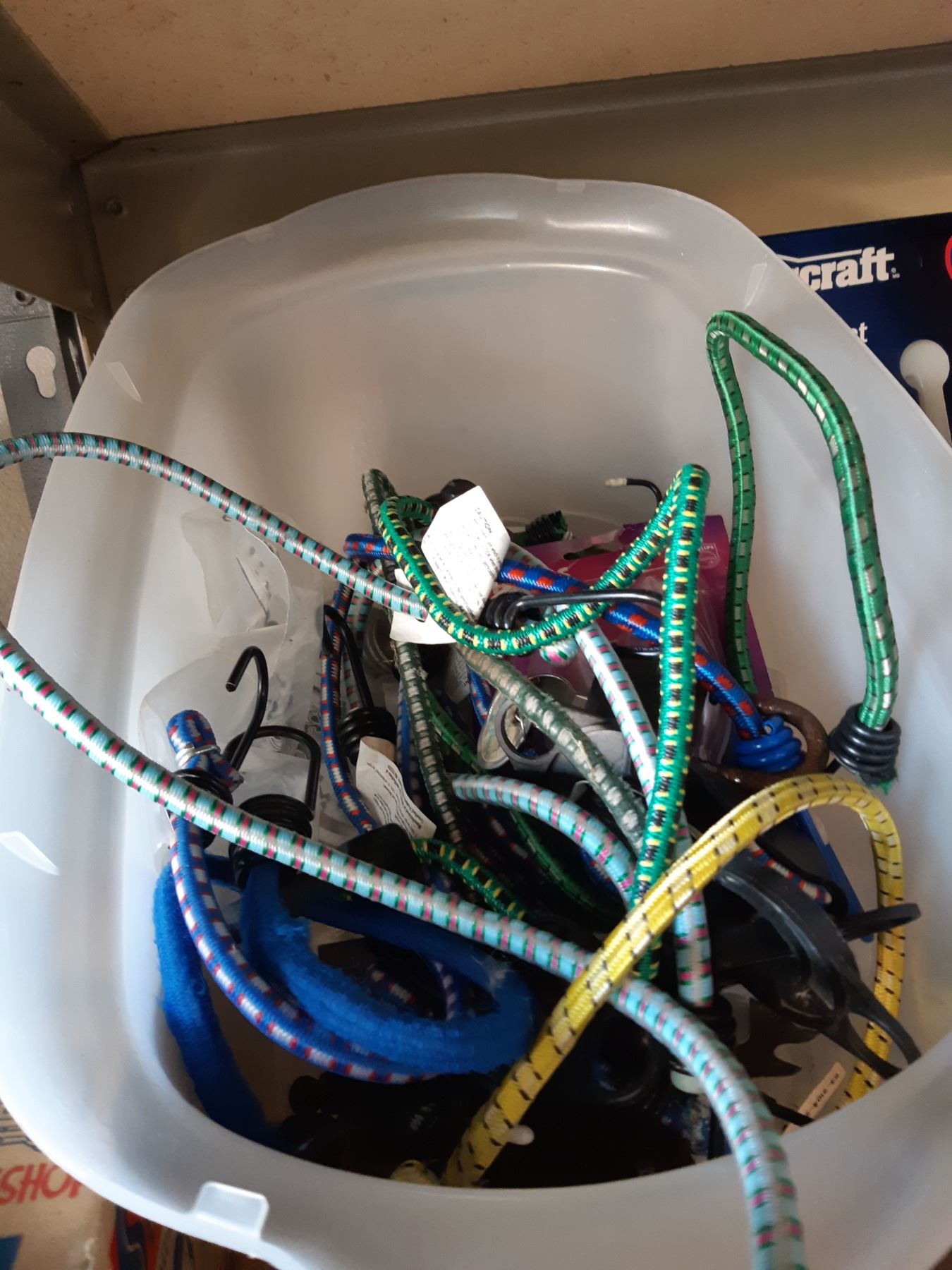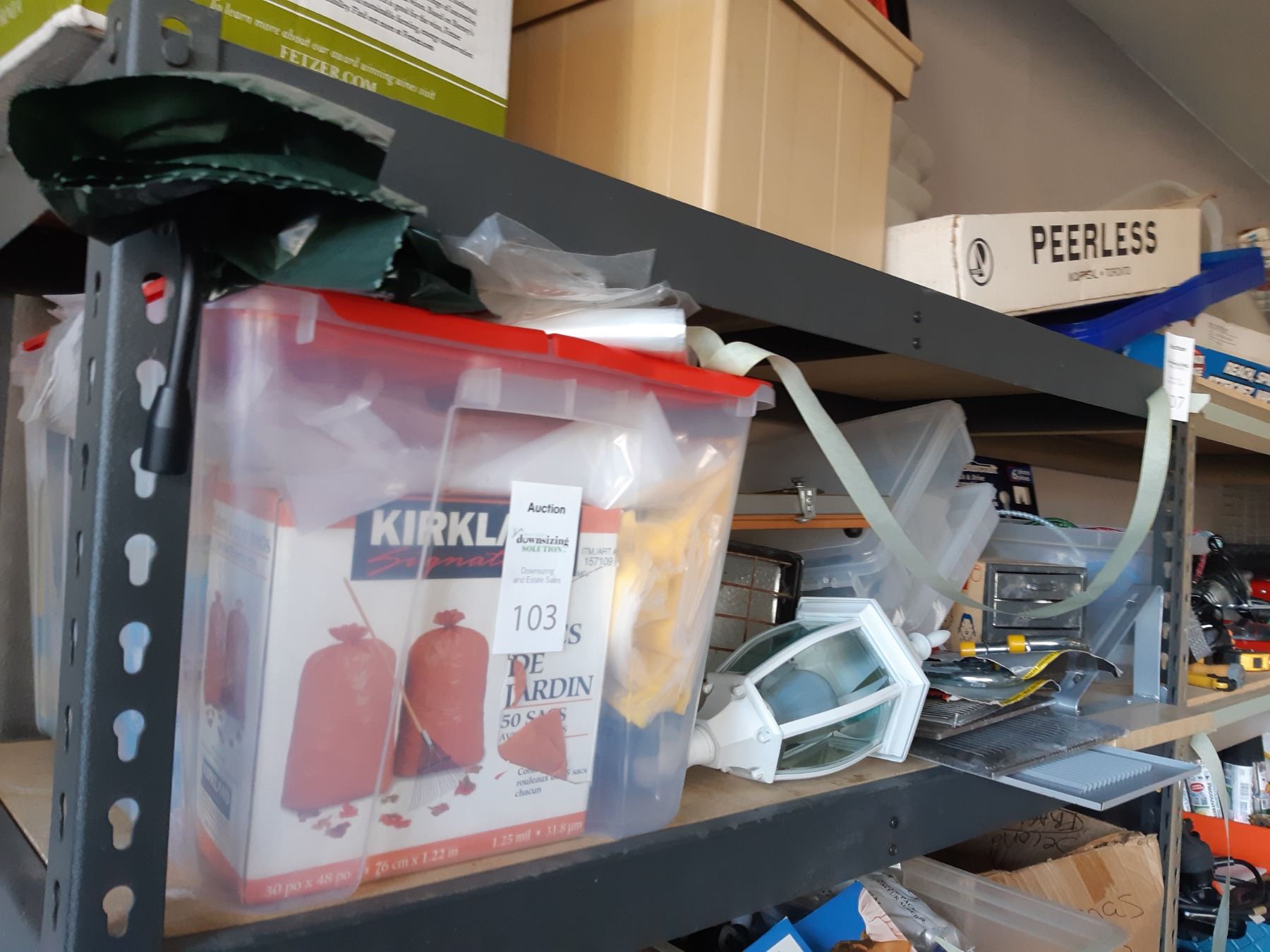 Includes, white metal lantern, measuring tapes, wrench, tools, tote of plastic bags. Pickup at 10 am