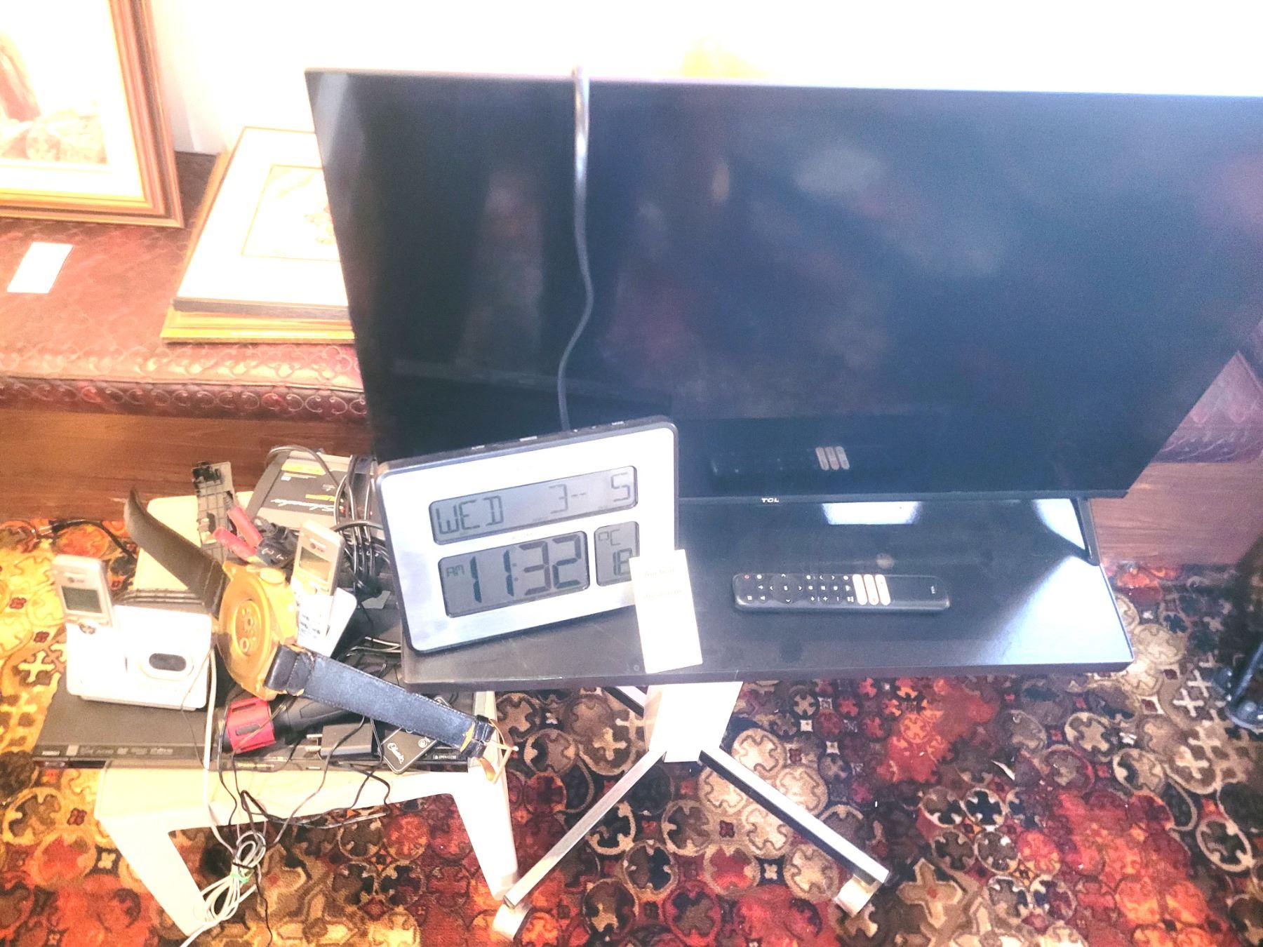 TCL TV 32",cordless phones, Panasonic blue ray disc player, battery charger, watch clock. Untested.includes tv stand optional. Pick up 9-10