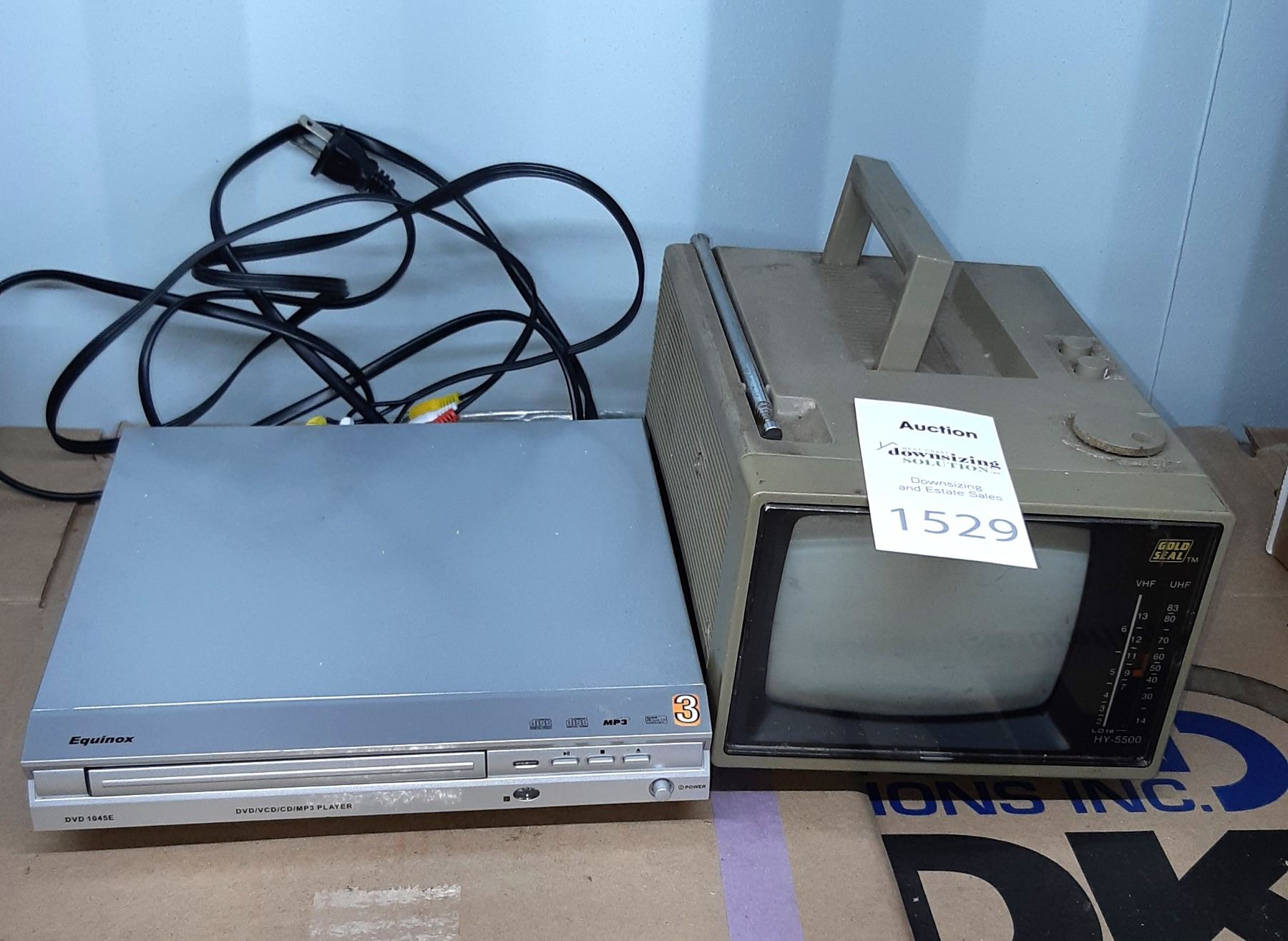 Equinox Disk player, and Gold Seal B&W portable tv untested. Pickup at 10 am