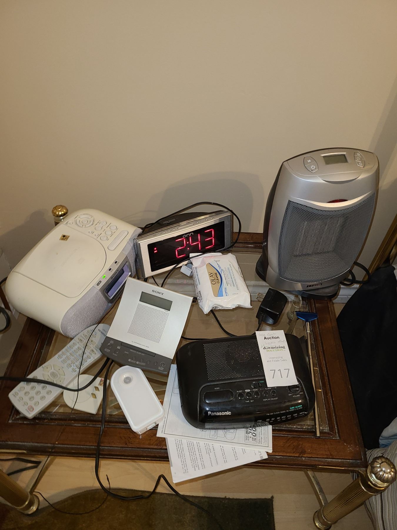 Electronics include Panasonic alarm, Sony CD player with extra speaker, Lasko heater, and Sunbeam night light. All working condition. Pickup 9 am.