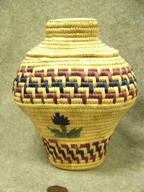 Elliptical shaped Yup'ik basket made by Ellen Dock of Kipnuk with dyed grass design- dyed grass flower on both sides- 8" tall