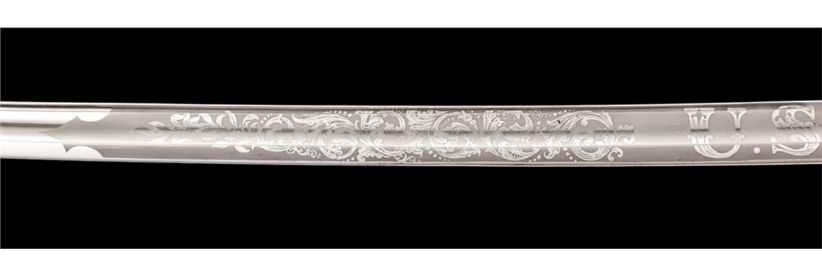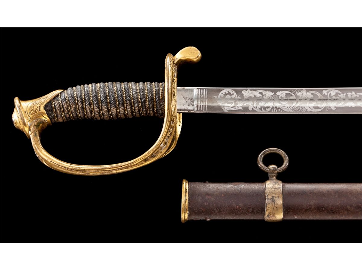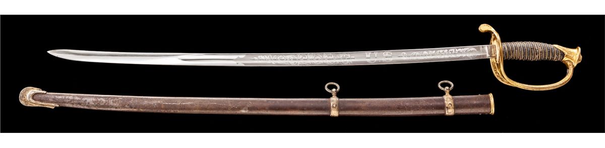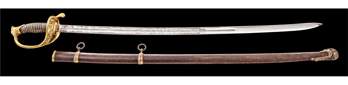 Civil War Era Foot Officer's Sword, by Emerson & Silver, Trenton, NJ, 32'' finely etched polished blade, with ''U.S.'' surmounted by foliate scrolls to left side of blade; right side similarly adorned but with Federal eagle holding E Pluribus Unum ribbon. Nicely cast gilt guard and cap, finely wound two-strand wire wrap over skateskin grip. In black iron scabbard with gilt throat, double rings, and separate attached drag. Condition is near excellent with light thinning to grip and minor wear and toning to gilt grip components, as well as some spotting to bottom portion. Blade is excellent with only very light carbon spotting near guard. Scabbard with moderate general darkening, with thinning and dulling to gilt at rings and drag. Throat remains bright. Leather washer is present. Est.: $750-$1,000.