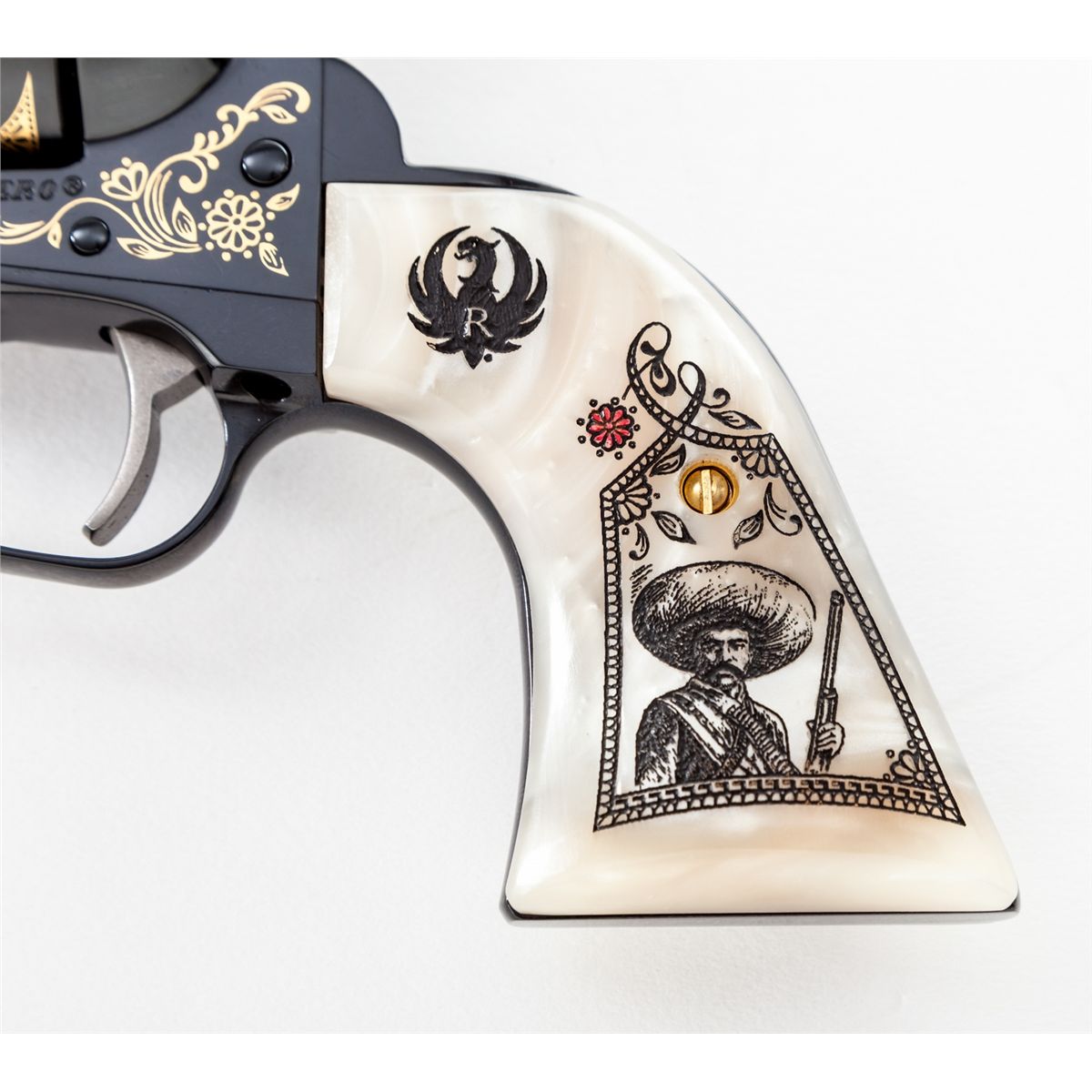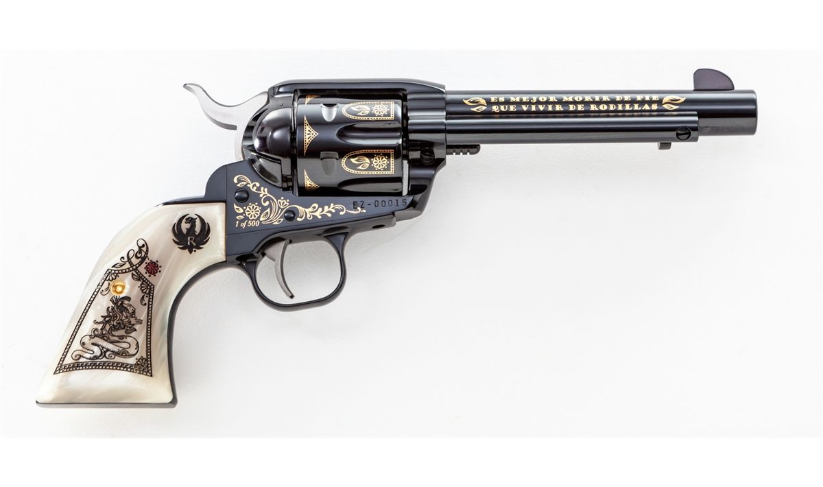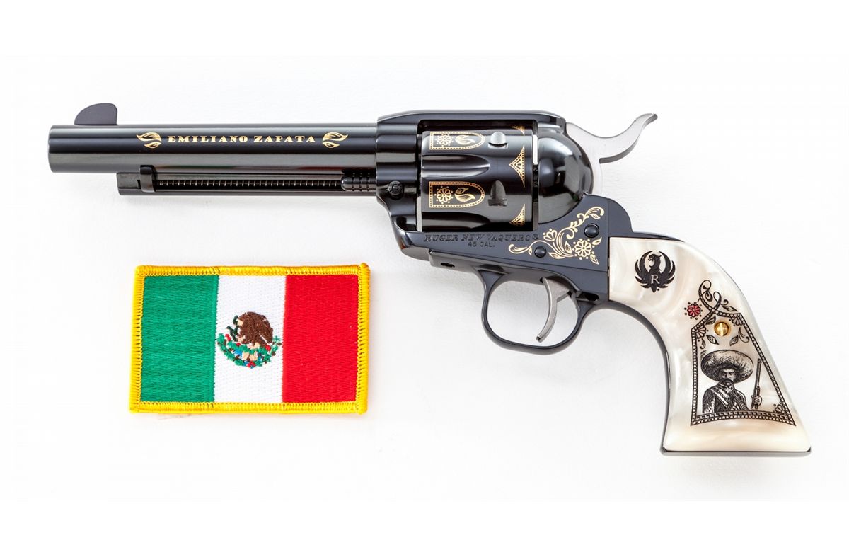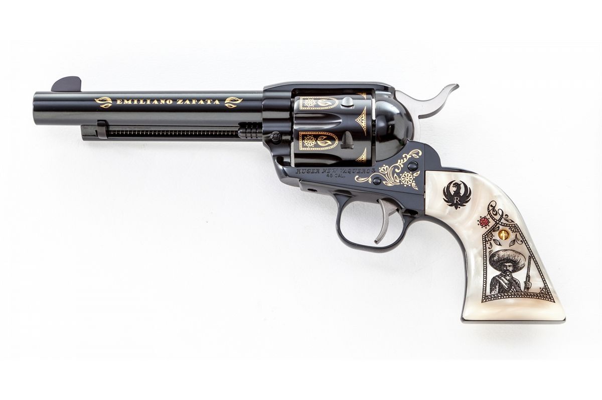 Emiliano Zapata Ruger New Vaquero Commemorative Single Action Revolver, #1/500, #EZ00015, .45 Colt cal., 5-1/2'' barrel, applied gold and royal blue finish, with special Zapata and Aztec motif carved pearl grips, in original box with all paperwork. Condition is excellent, appearing as new. Est.: $1,000-$1,500. (Modern)