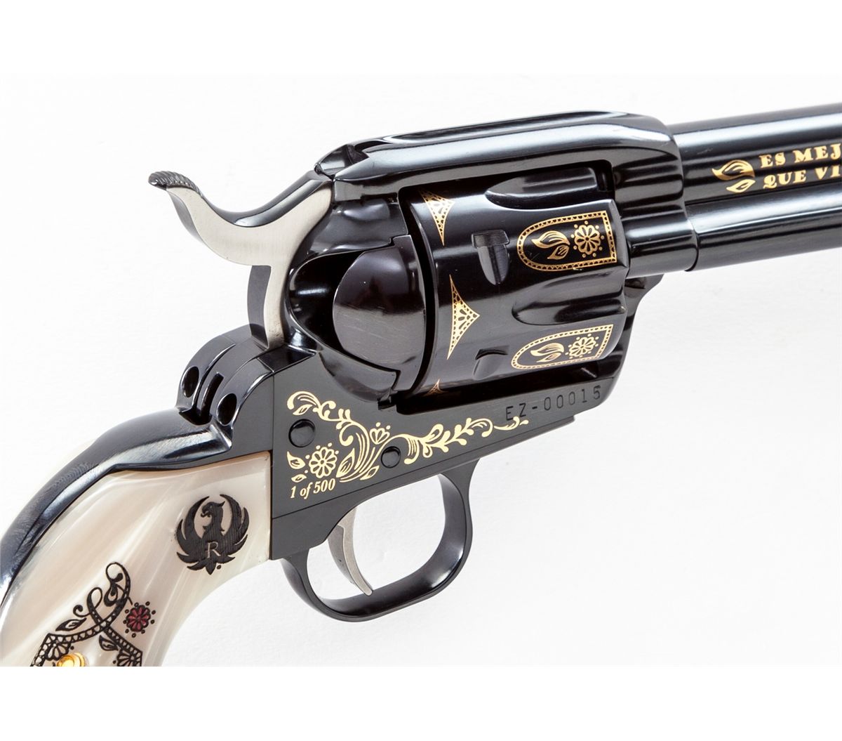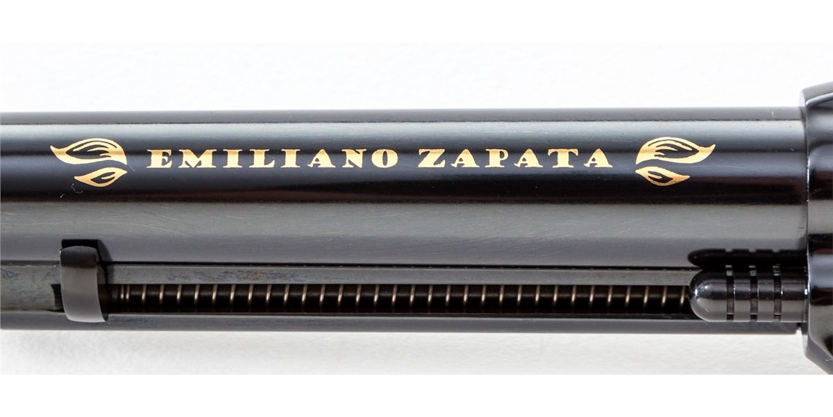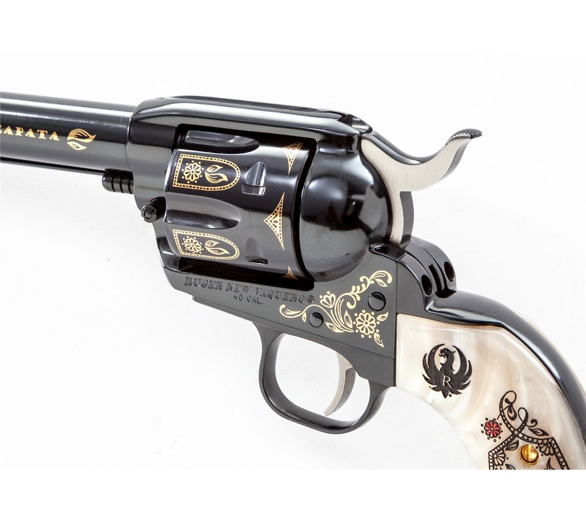 Emiliano Zapata Ruger New Vaquero Commemorative Single Action Revolver, #1/500, #EZ00015, .45 Colt cal., 5-1/2'' barrel, applied gold and royal blue finish, with special Zapata and Aztec motif carved pearl grips, in original box with all paperwork. Condition is excellent, appearing as new. Est.: $1,000-$1,500. (Modern)