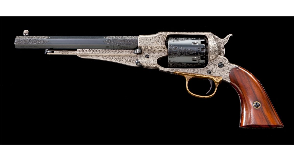 Factory Engraved Navy Arms Copy of Remington Model 1858 Percussion Revolver, #21779, .44 ball, 8'' blue octagon barrel and cylinder, French gray frame and loading lever, brass triggerguard, two-piece smooth walnut grips. Beautifully adorned with approx. 3/4 coverage. Condition is excellent showing only light marks from handling and appearing unfired. Est.: $750-$1,000. (Antique)