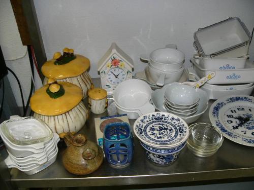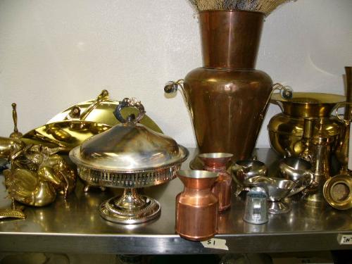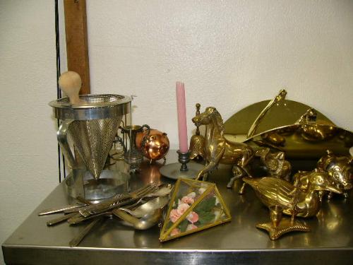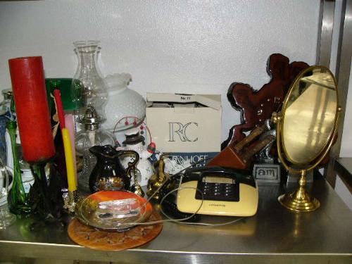 Entire cart of: collection of brass and copper, collection of pottery pictures, kerosene laps, burl wood clock, pair of eagle banks, set of oven wear, cookie jars, clock, assorted wood handled kitchen utensils, teapots, etc (227)