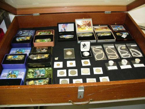 Entire case of gemstones, freshwater pearls, coins, and pocket knives (124)