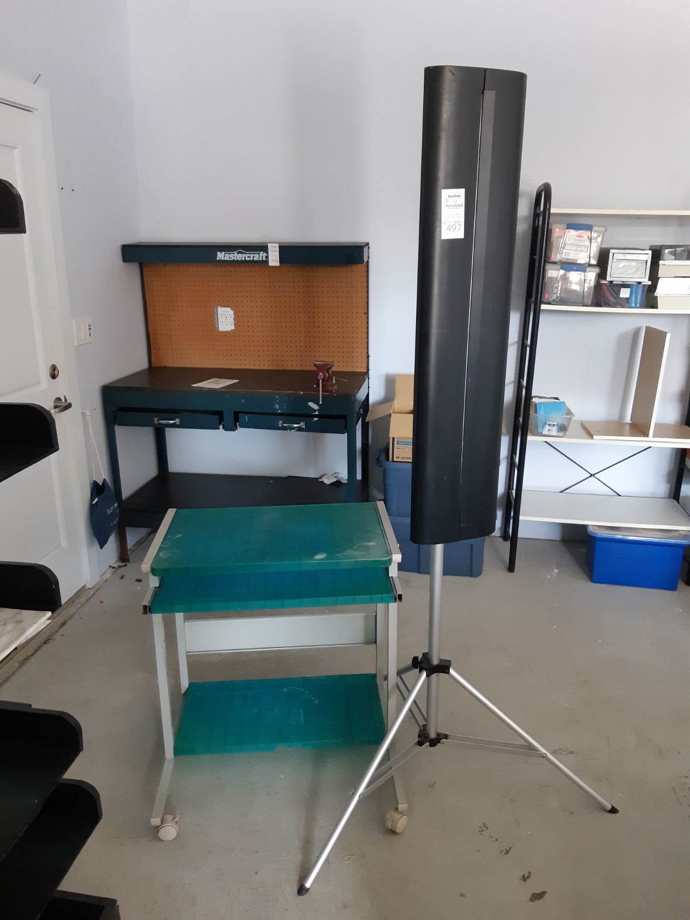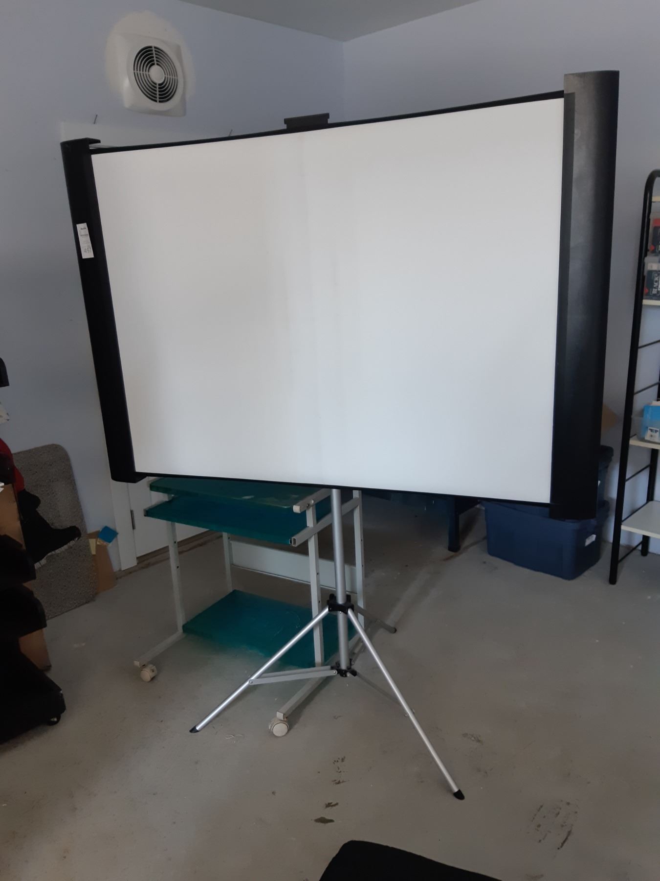 Epson America Accolade projector screen on tripod legs. Expands to 4' wide. model #ELPSC80 Rolling computer station pickup at 11 am