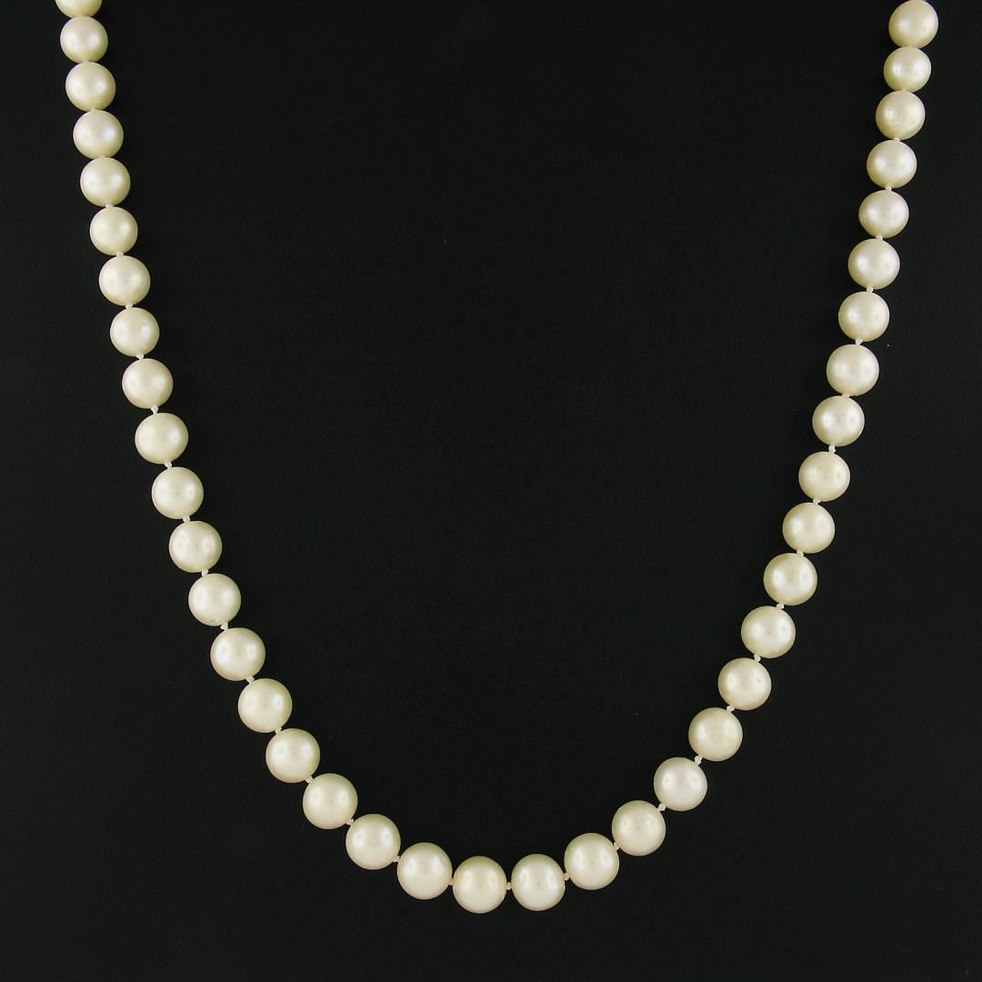 A strand necklace with 14k yellow gold clasp, featuring 48 round shape cultured pearls (8.5-9.5mm). It weighs a total of 49.65 grams, measures 9.5mm wide, and measures 19 inches in length.