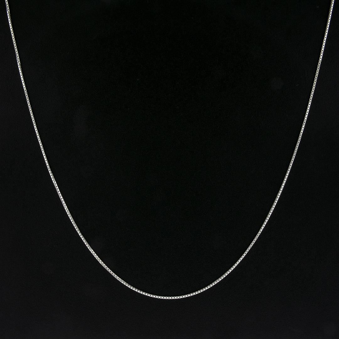 A solid 14k white gold box link chain necklace. It weighs a total of 4.76 grams, measures 1.3mm wide, and measures 20 inches in length.
