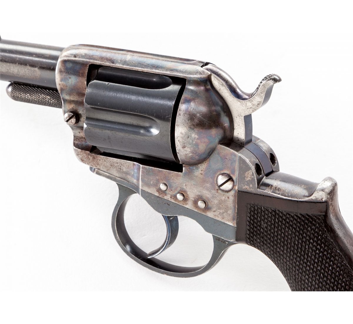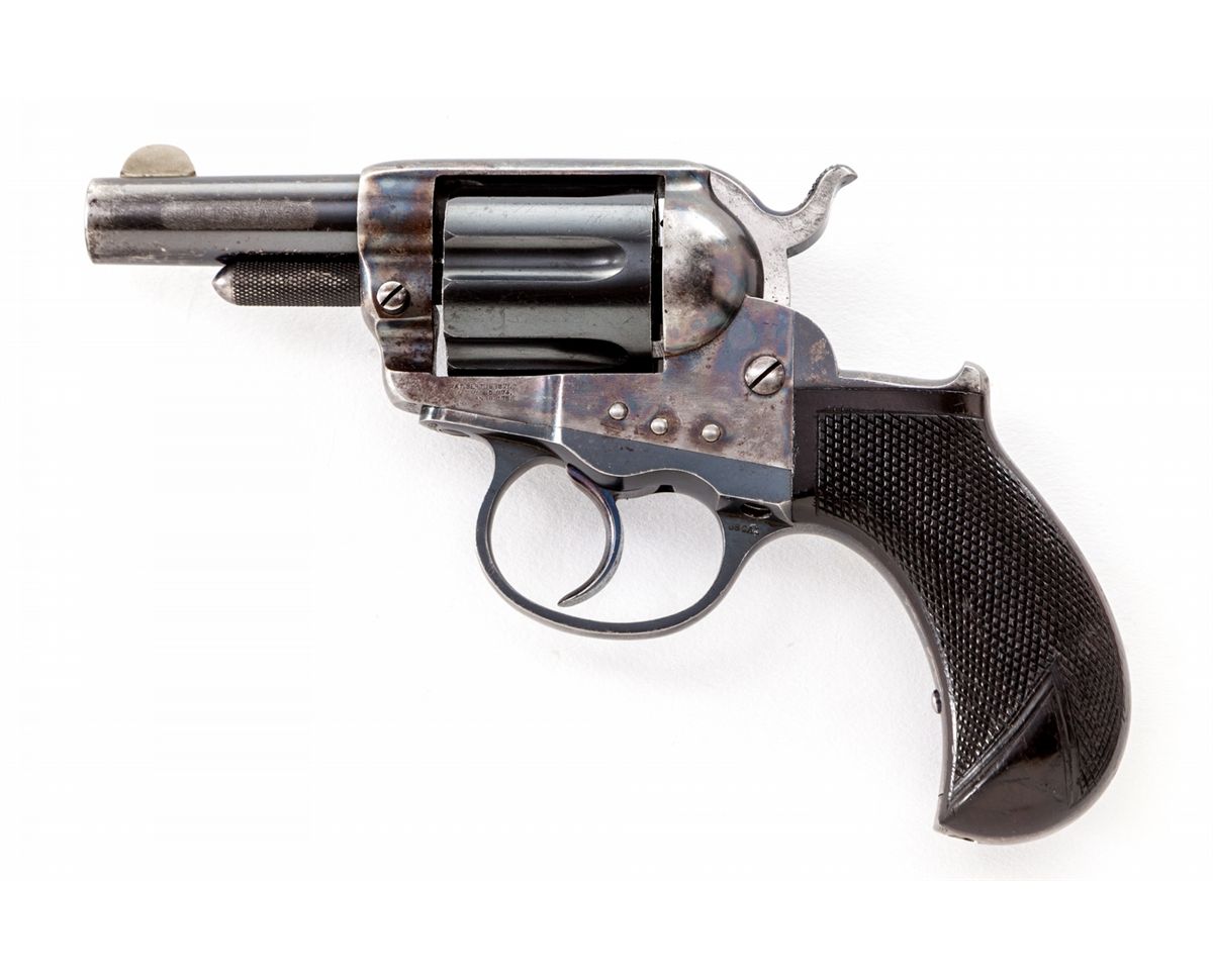 Etched Panel Colt Model 1877 Double Action Revolver, #22165, .38 Colt cal., 2-1/2'' etched barrel, blue and case hardened finish, with factory checkered rosewood bird's head grip. Mfg'd 1880. Condition is excellent retaining approx. 92% original blue with most of the losses to front and back straps; 75% case hardened hues are present. Grips show mild flattening to checks with scattered losses to highpoints. Action is crisp, bore is near excellent. Est.: $3,500-$5,000. (Antique)