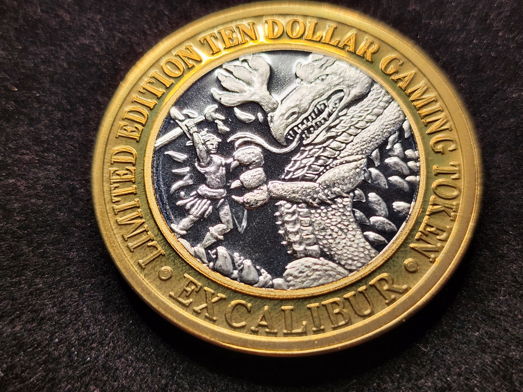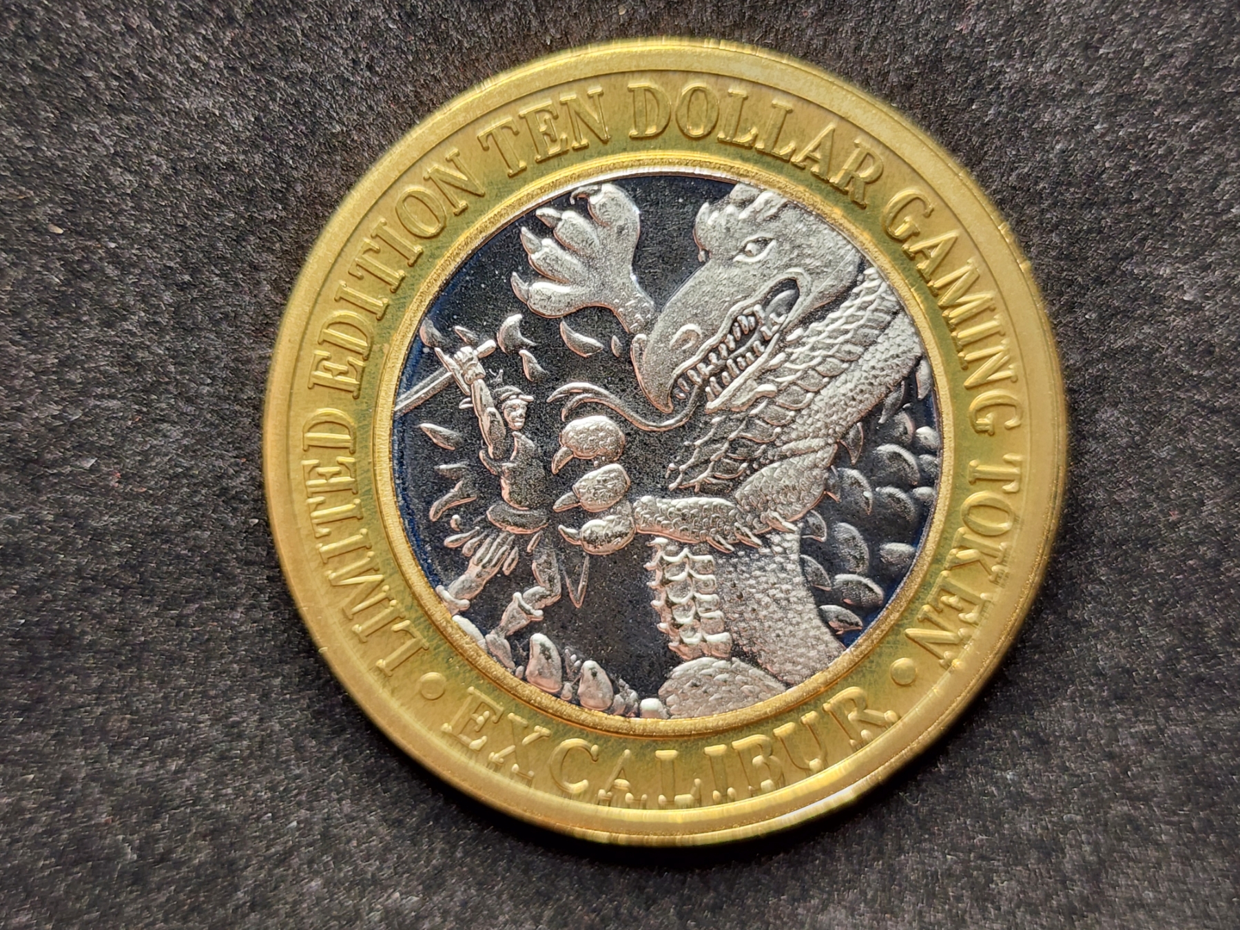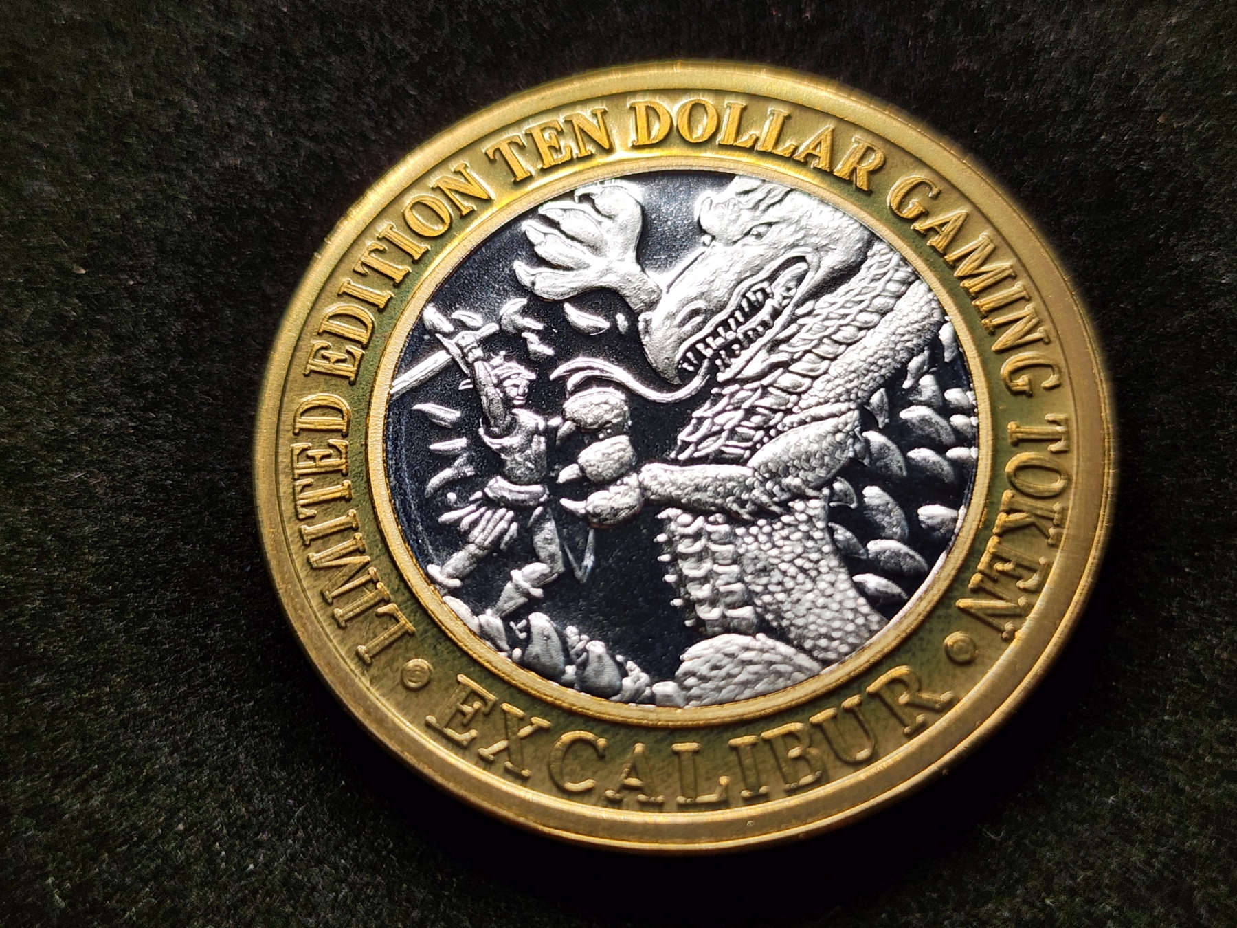 Excalibur Las Vegas, Nevada Limited Edition Ten Dollar Gaming Token .999 Fine Silver - About 0.6 Troy Oz Silver - Ft. Dragon & Knight