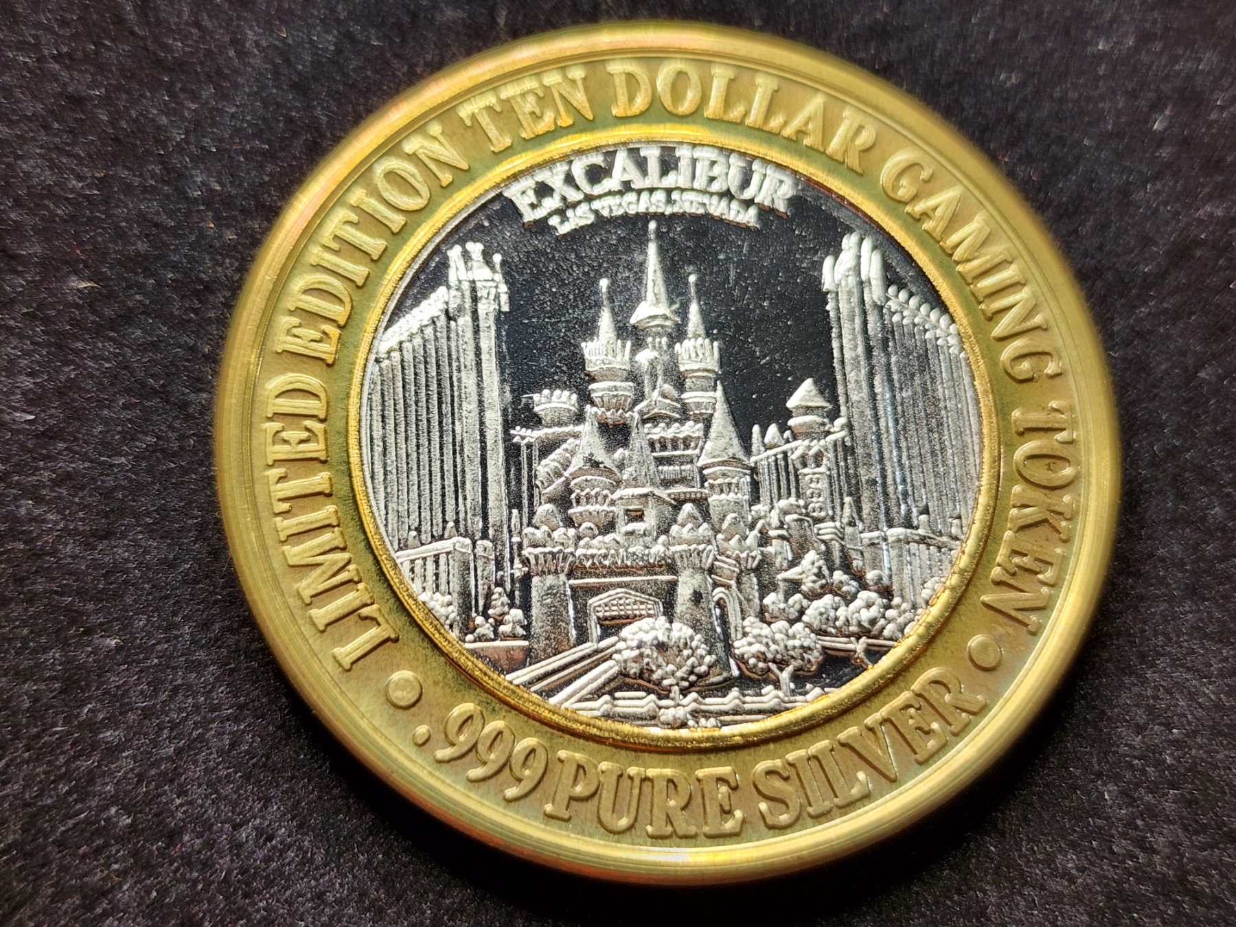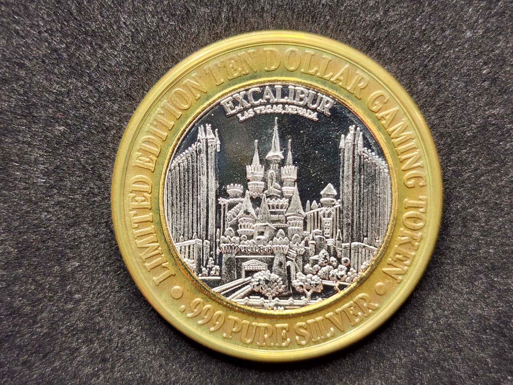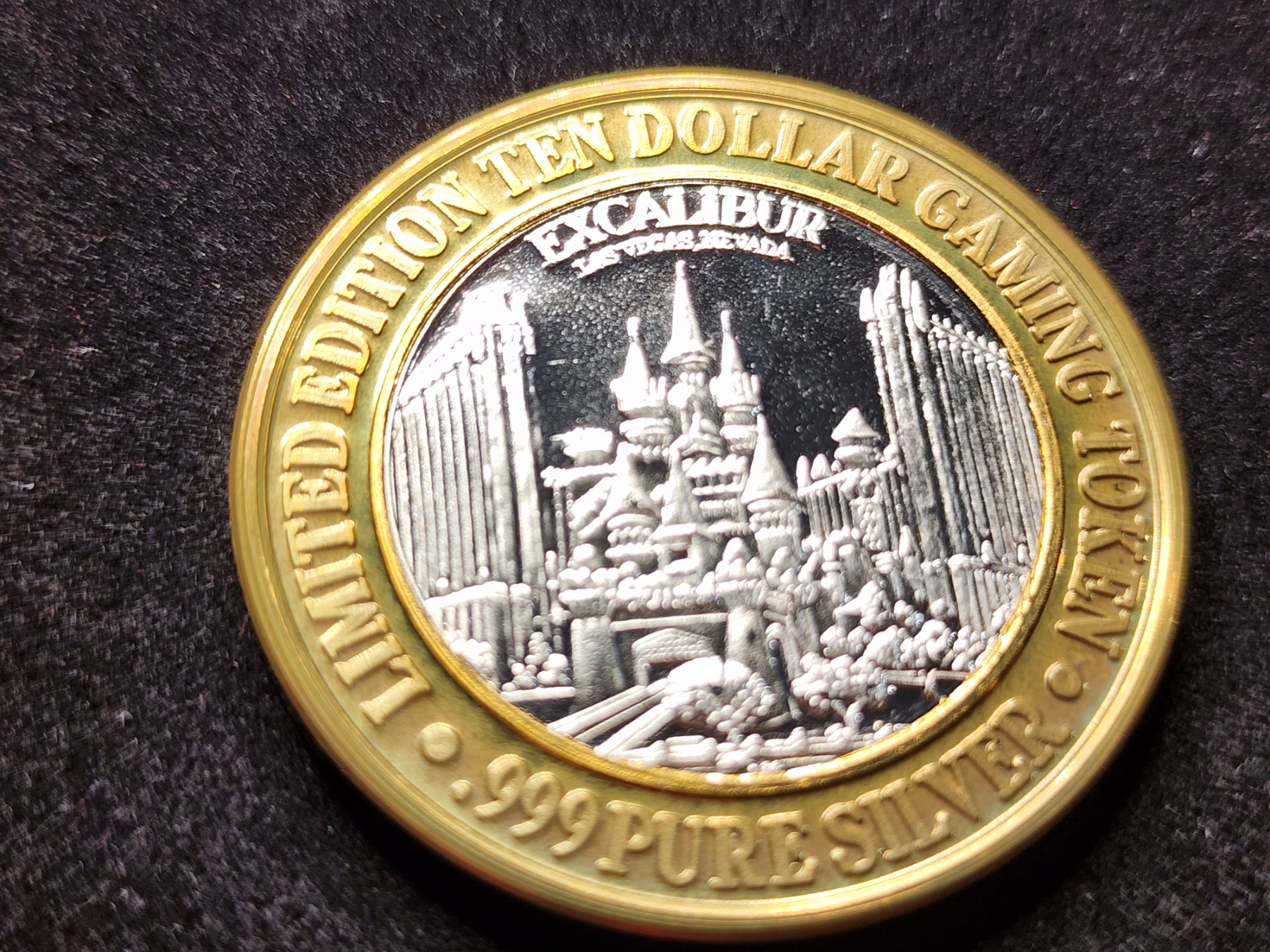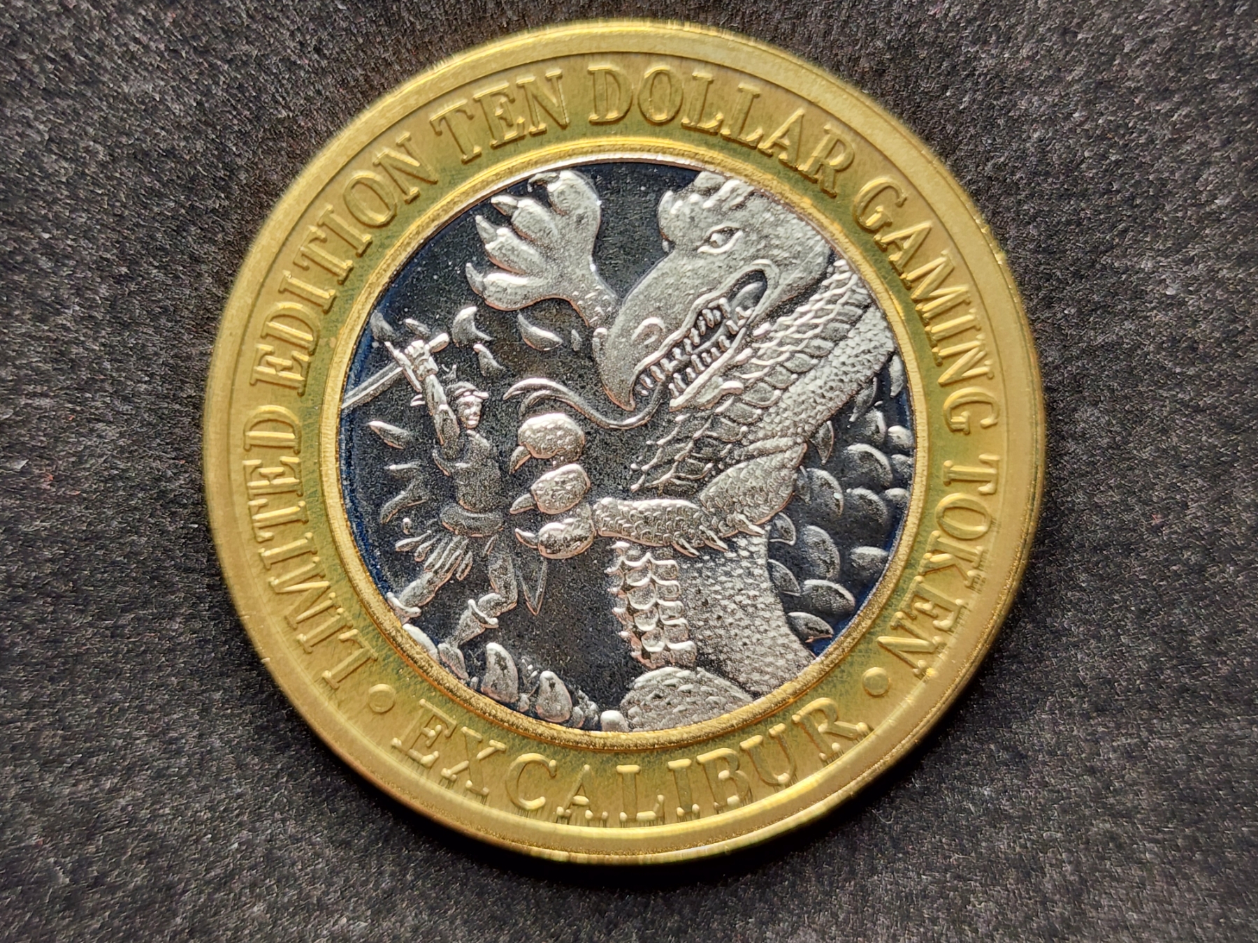 Excalibur Las Vegas, Nevada Limited Edition Ten Dollar Gaming Token .999 Fine Silver - About 0.6 Troy Oz Silver - Ft. Dragon & Knight