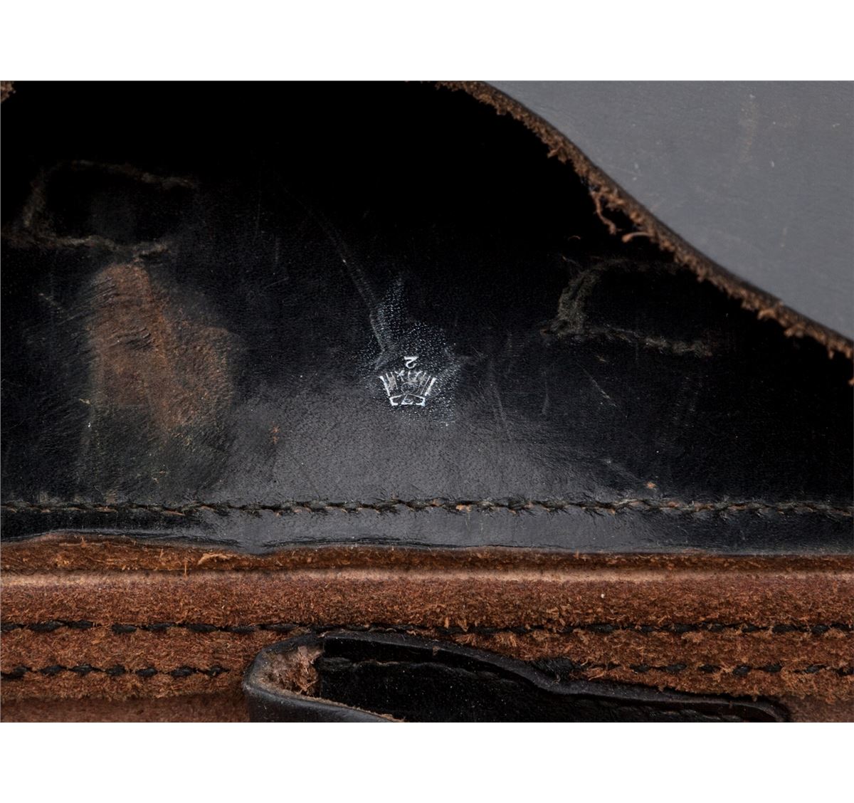 Extremely Rare 1945 dated Krieghoff Luger, #13090, 9mm, 4'' barrel, salt blue finish with straw small parts, black checkered molded grips with smooth border, and two (2) blue extruded magazines with blank black plastic bases, in one internally proofed Luftwaffe holster. Chamber area dated 1945, Krieghoff logo to central toggle link; frame, upper receiver and barrel with Luftwaffe inspection marks. Considered extremely rare with probably less than 100 mfg'd and only several known. Condition is excellent retaining approx. 97% original blue with wear at muzzle and high edges of sideplate, thinning to straps. Grips show light general wear. Action is crisp, bore is fine. All visible matching numbers. Holster shows evidence of applied polish, with light impressions and tight stitching. Est.: $12,000-$18,000. (C&R/PPT) (John Siroonian estate)