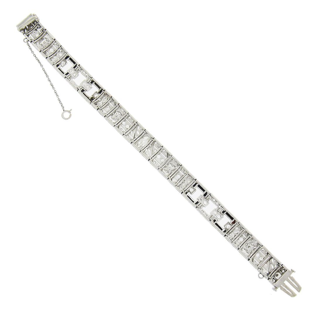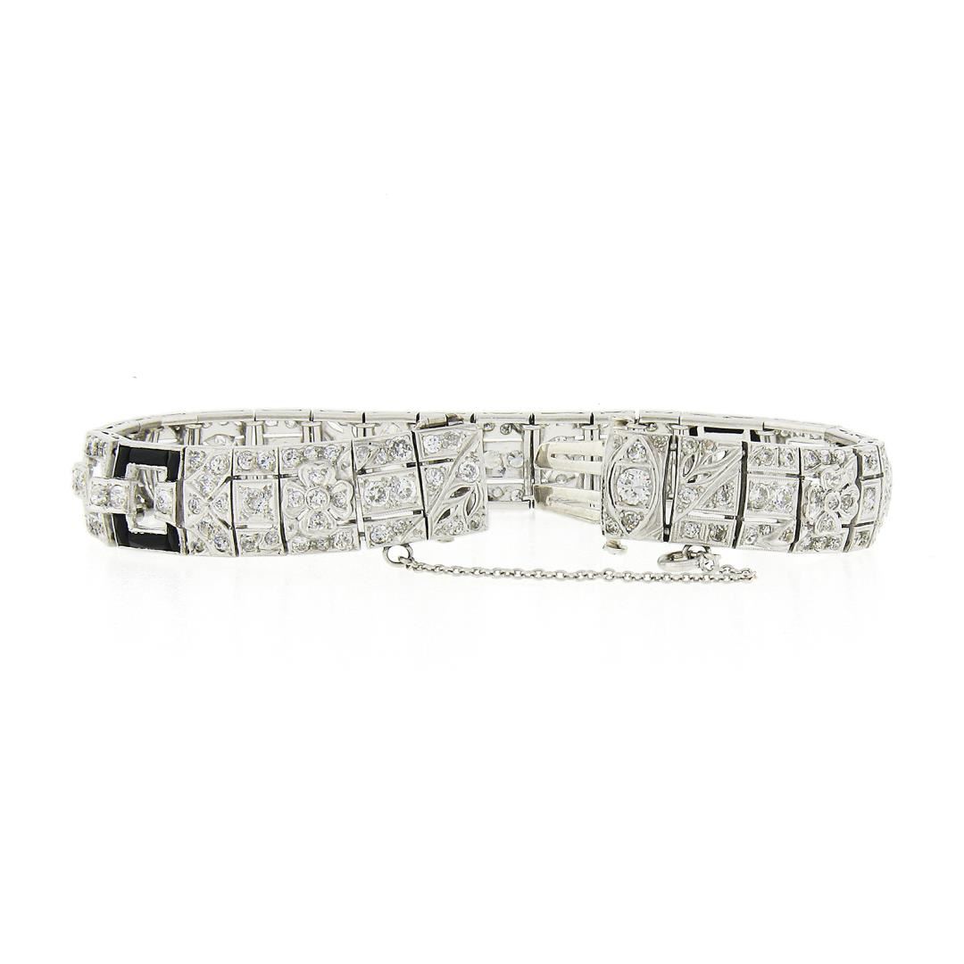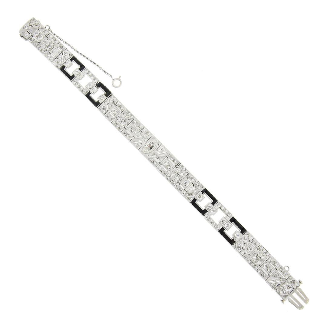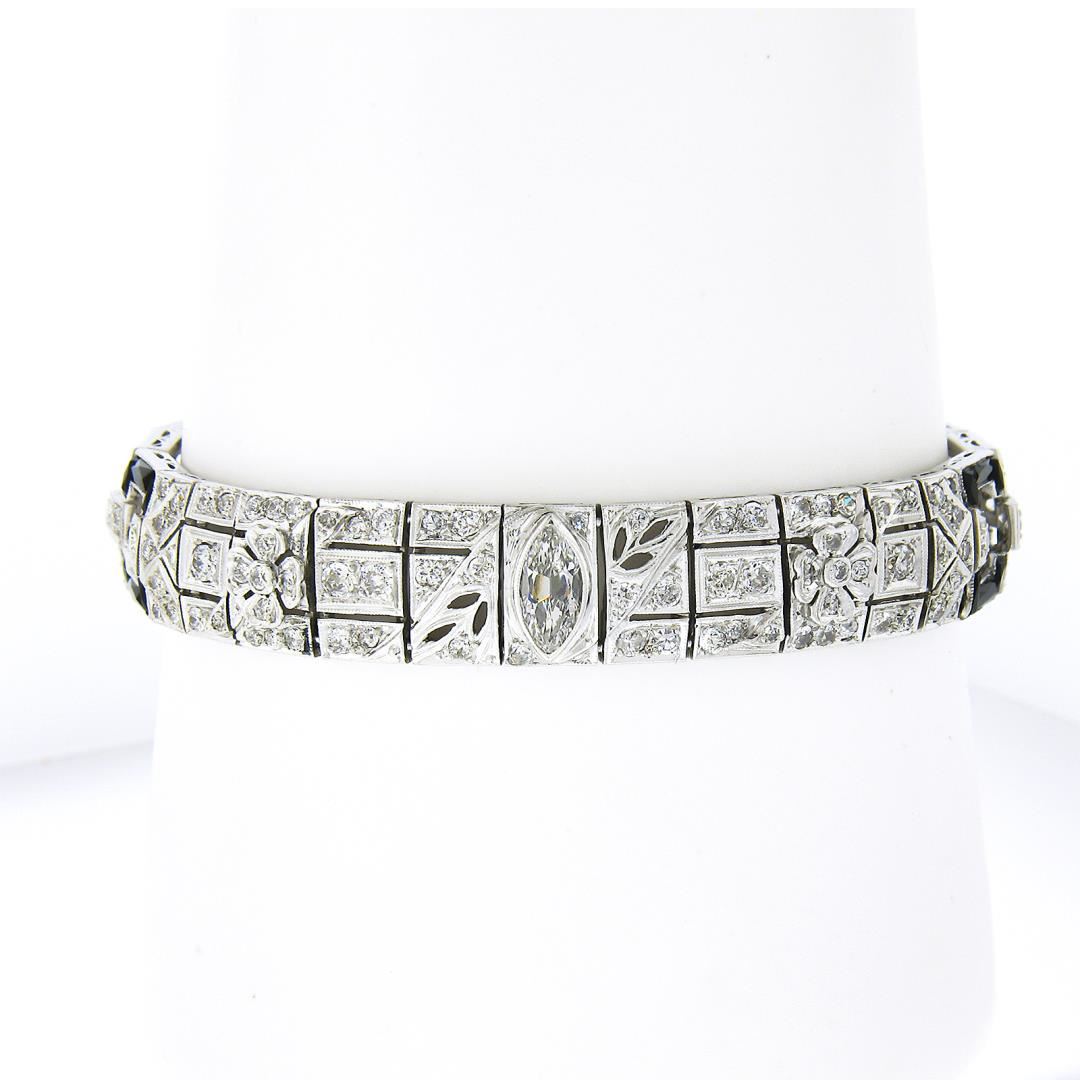 An antique solid platinum line bracelet, with 1 old marquise cut natural diamond (H/I Color - SI1 Clarity - 0.58ctw), 182 old european & old single cut natural diamonds (G/I - VS1/SI2 ; 5.45ctw), and 24 french baguette cut natrual black onyx. It weighs a total of 35.30 grams, measures 10.9mm wide, and measures 6.75 inches in length.