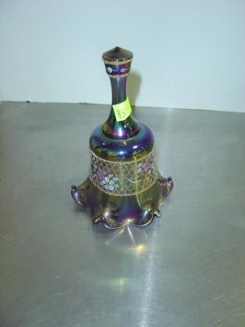 FENTON GLASS BELL; PURPLE PAINTED WITH FLOWERS