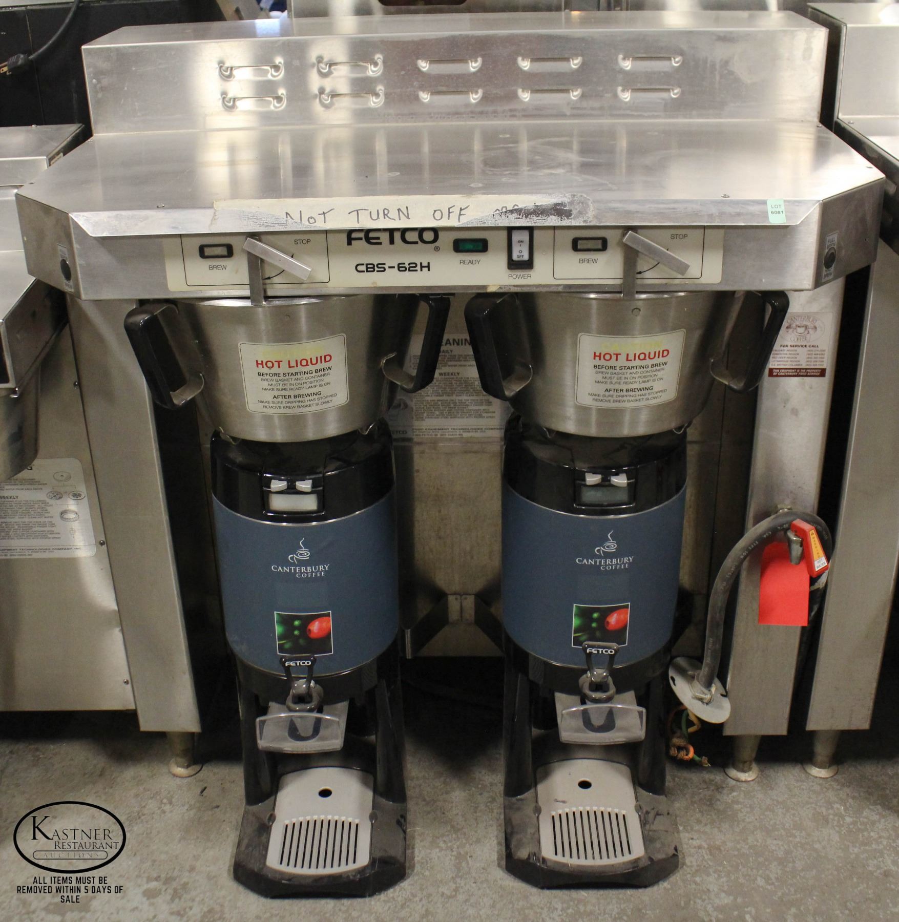 24GAL/HR W/ HOT WATER TAP. MODEL:CBS-62H. 120/208-240V, 3 PHASE, 38.3-44.1A, 13.6-18.1KW, 4 WIRE + GROUND *****ALL ITEMS IN THIS AUCTION ARE SOLD IN UNTESTED CONDITION - THERE ARE NO GUARANTEES AS TO CONDITION OR COMPLETENESS OF ITEMS IN THIS AUCTION. THERE WILL BE NO REFUNDS UNDER ANY CIRCUMSTANCE. ALL ITEMS ARE SOLD AS IS, WHERE IS. VIEWING WILL BE AVAILABLE JUNE 10TH - 10:00AM TO 5:00 PM. VIEWING IS HIGHLY RECOMMENDED! **ALL ITEMS MUST BE REMOVED BY 5PM MONDAY, JUNE 19TH, 2023. ALL REMAINING ITEMS WILL BE SUBJECT TO A $6.00 PER DAY STORAGE CHARGE. ANY ITEMS REMAINING AFTER MONDAY, JULY 3RD, 2023 WILL BE CONSIDERED FORFEITED. NO REFUNDS WILL BE ISSUED FOR FORFEITED ITEMS.** TO SCHEDULE A PICK UP APPOINTMENT CLICK HERE
