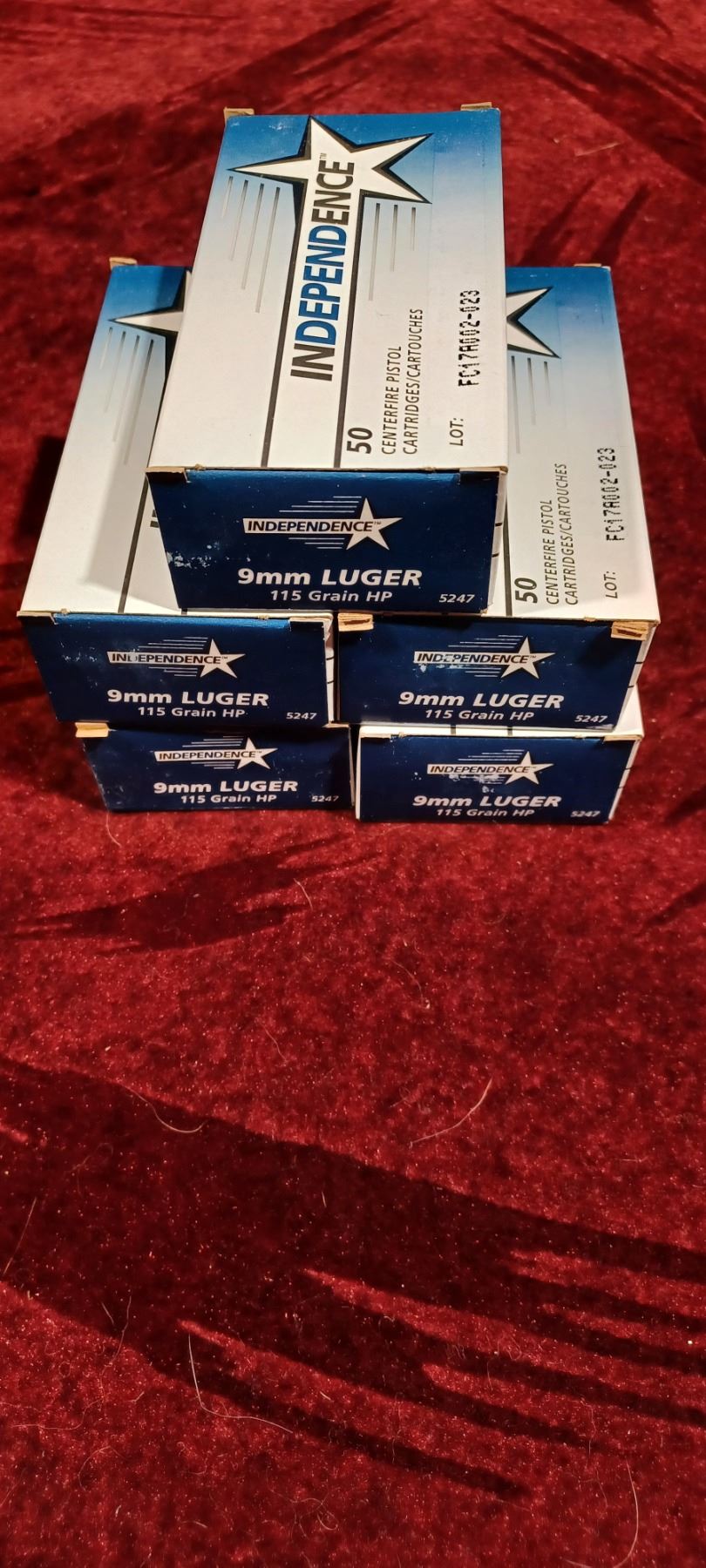 FIVE BOXES OF 9MM LUGER 115GR HP (250 ROUNDS)
