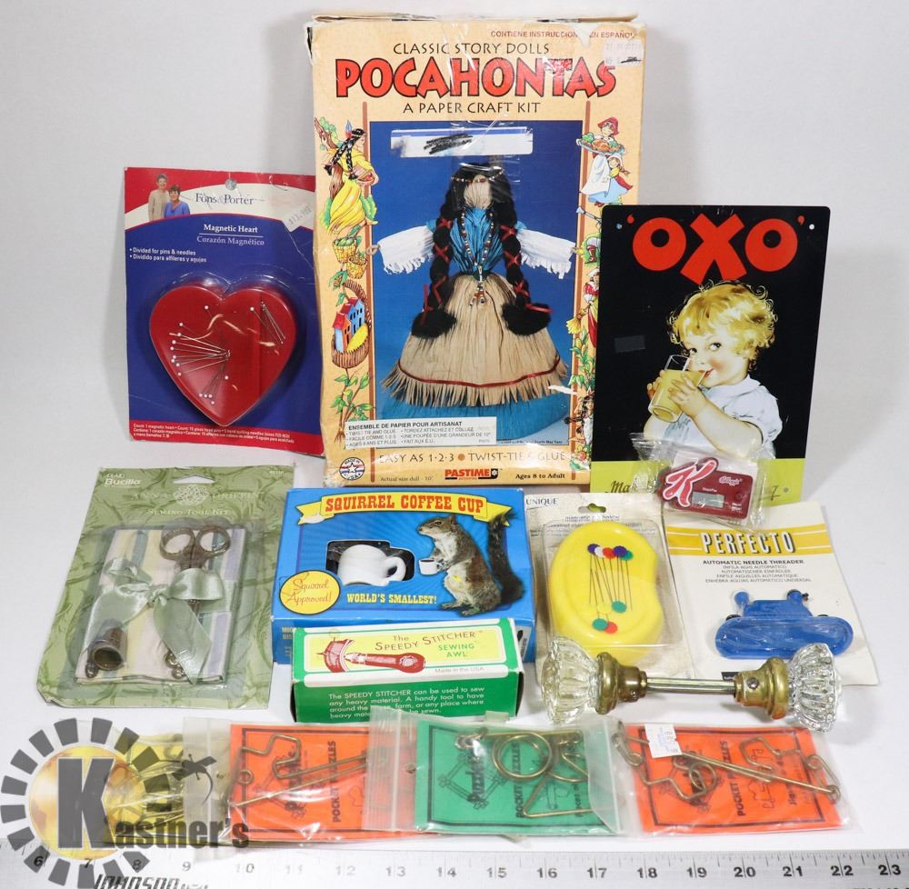 ITEMS PERFECTO AUTOMATIC NEEDLE THREADER (ITALY) 4 1986 PUZZLETTS, SPEEDY STITCHER SEWLING AWL (USA), GLASS DOOR KNOB & MORE (MOST ITEMS ARE SEALED OR UNUSED). COLLECTIBLES