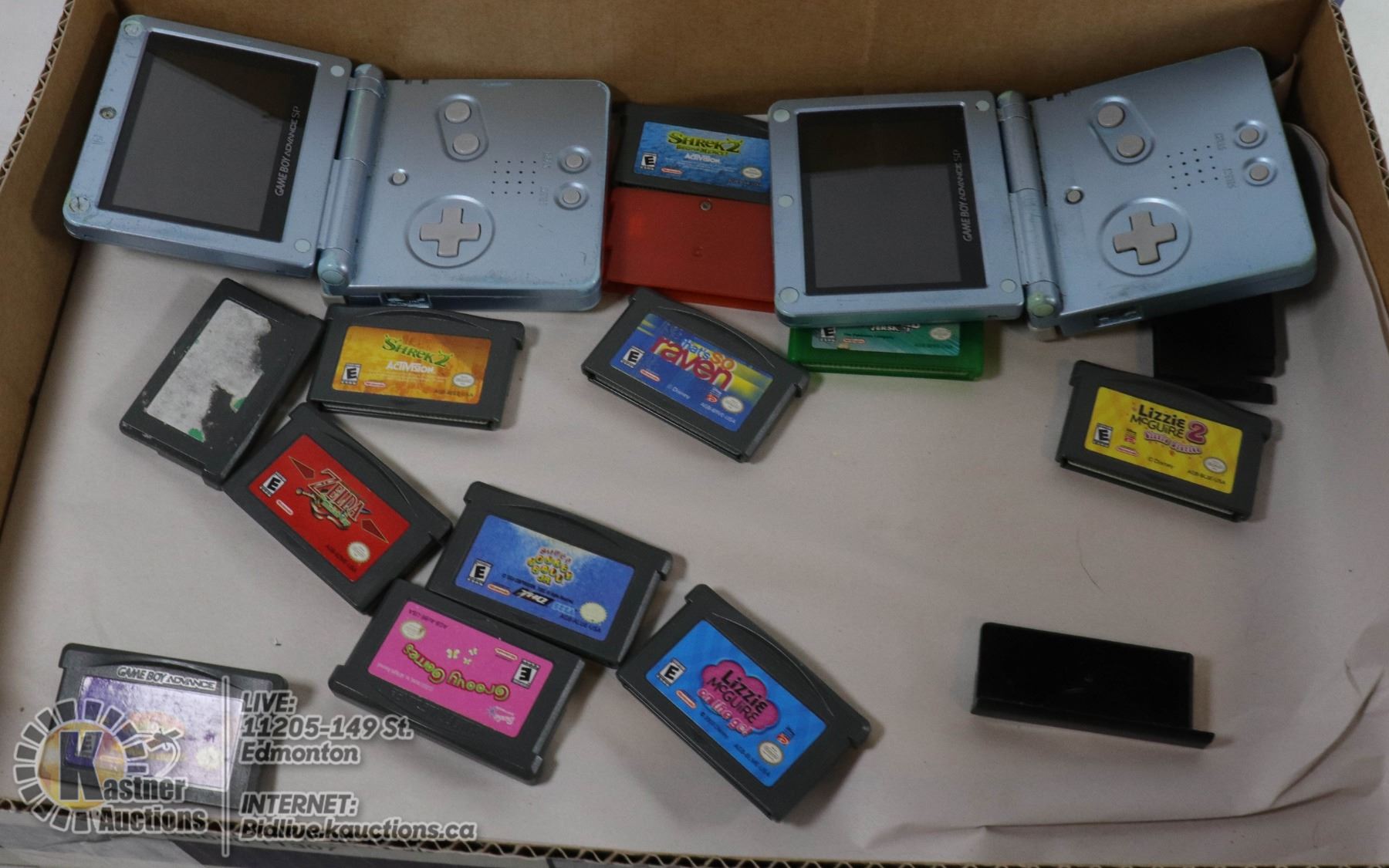 FLAT WITH 2 GAMEBOY ADVANCED SP HAND-HELD GAMING SYSTEMS WITH 15 GAMES INCLUDING POKEMON, ZELDA, SHR