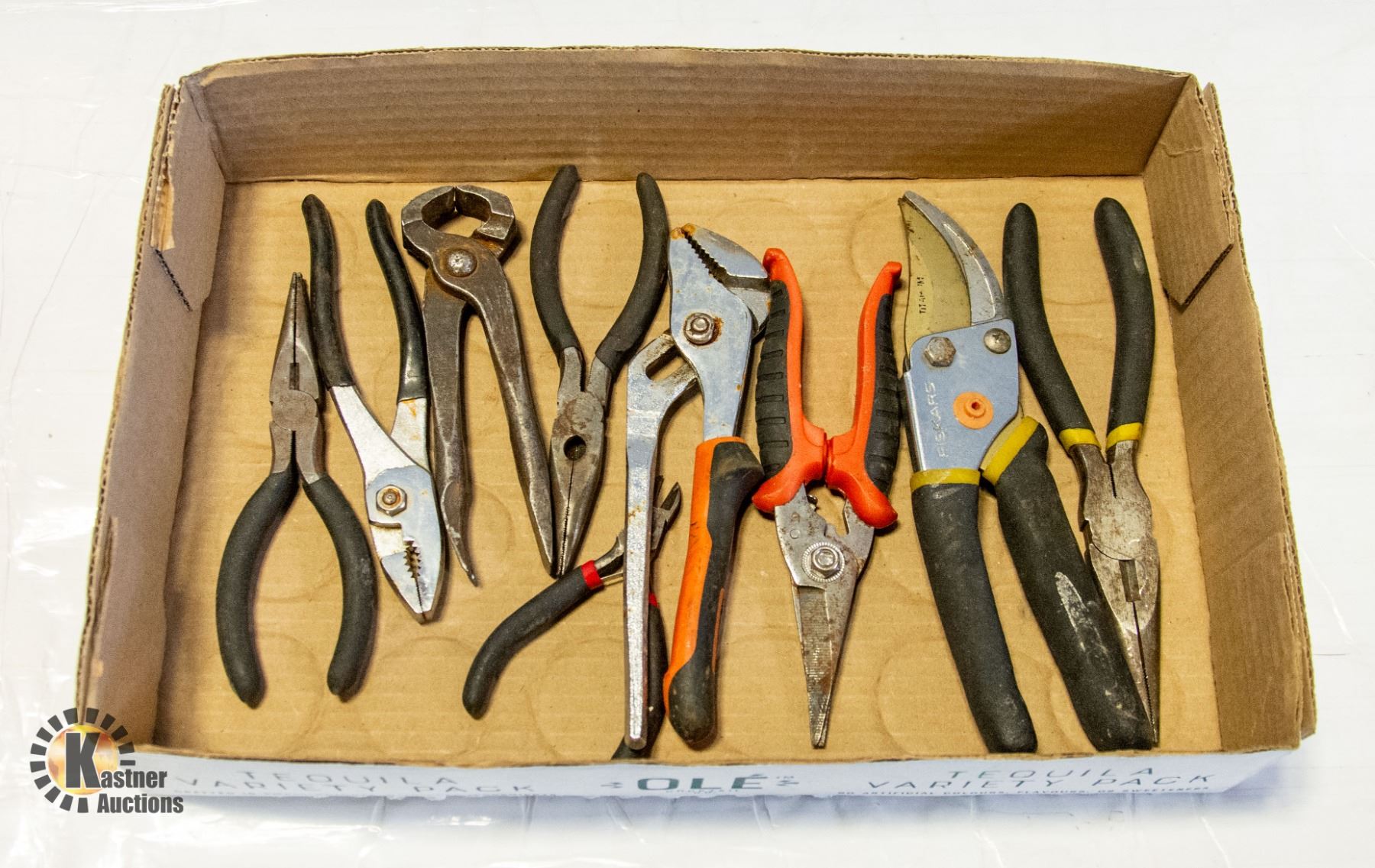 FLAT WITH 9 PAIRS OF VARIOUS PLIERS