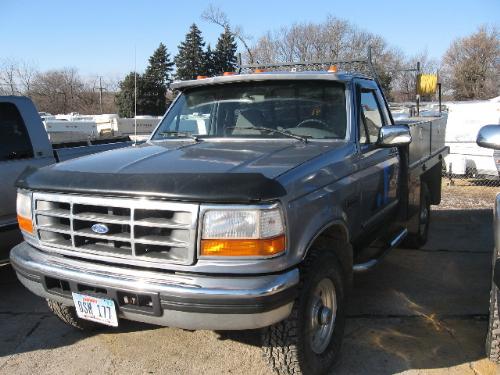 1997 FORD F250 HD 4 X 4 FLATBED UTILITY TRUCK, s/n 1FTHF26FXVEB40186: POWER STROKE 7.3L TURBO DIESEL ENGINE, AUTO TRANS, 9ft. STEEL BED, SIDE MOUNTED TOOLBOXES, BED RACK, SUN VISOR