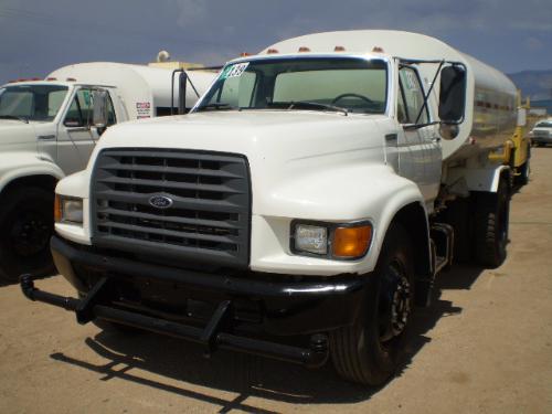 1997 FORD F800 2,000 GALLON S/A WATER TRUCK, s/n 1FDXF80C1VVA14792: CUMMINS 5.9L DIESEL ENGINE, 6 SPD. TRANS., PTO DRIVEN PUMP, FRONT, SIDE & REAR PRESSURE SPRAY, HOSE REEL, AIR BRAKES, 11R22.5 TIRES