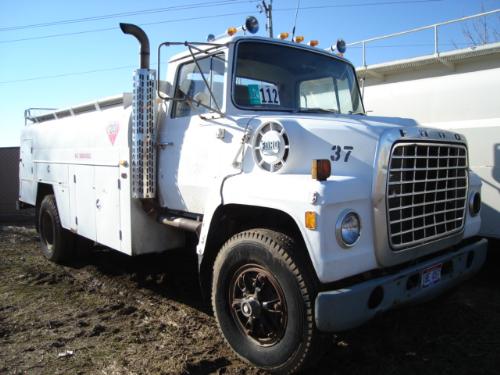 1976 FORD 8000 S/A FUEL TRUCK, s/n F181DVD882097: CATERPILLAR 3208 DIESEL ENGINE, 5 SPD TRANS, 2 SPD AXLE, 2,000 GALLON 5 COMPARTMENT TANK, 400 /400/400/400/400, HOSE REEL, METER SYSTEM, 8.25 X 20 TIRES, SPOKE WHEELS
