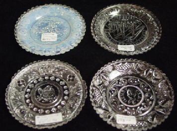 American, mid 19th C. (A) clear opalescent in the manner of Sandwich, scroll and floral motifs. (B) spread-wing eagle with shield in center, floral scroll border, (C) Benjamin Franklin / sailing ship, (D) Henry Clay. Condition: (C&D may be 20th C.).