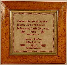 , maker: "Sarah Mason", aged 12 years, 1856, framed in bird's-eye maple molding, image 5 5/8"x 5 1/8", English.