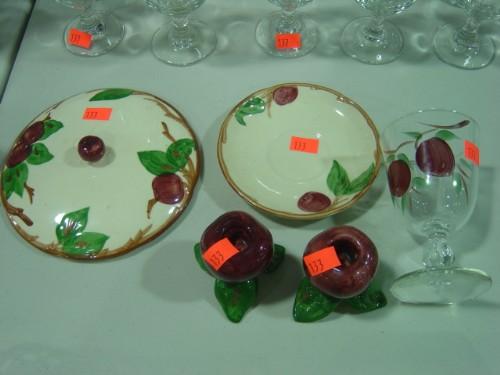LOT OF 5 FRANCIS ION PCS; 2 CANDLE STICKS, PAINTED GOBLET; SAUCER AND CASSEROLE LID