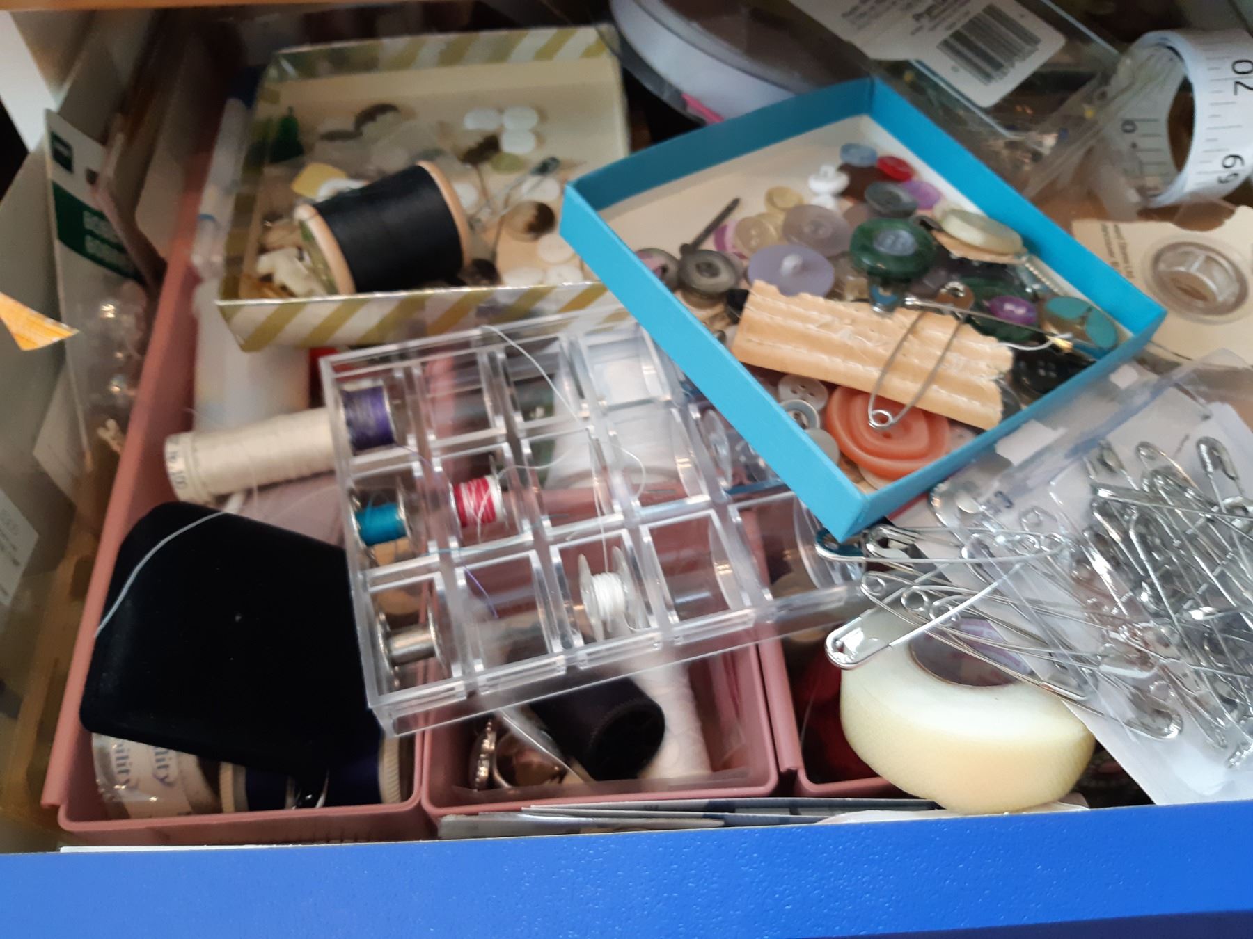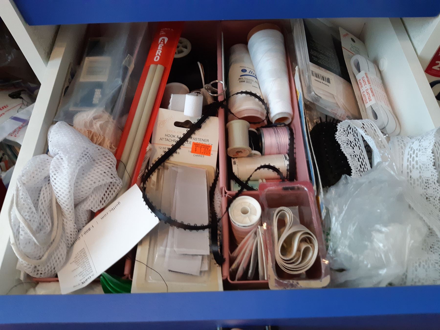 Fabric, sewing notions and contents of 4 drawers, pickup 11am