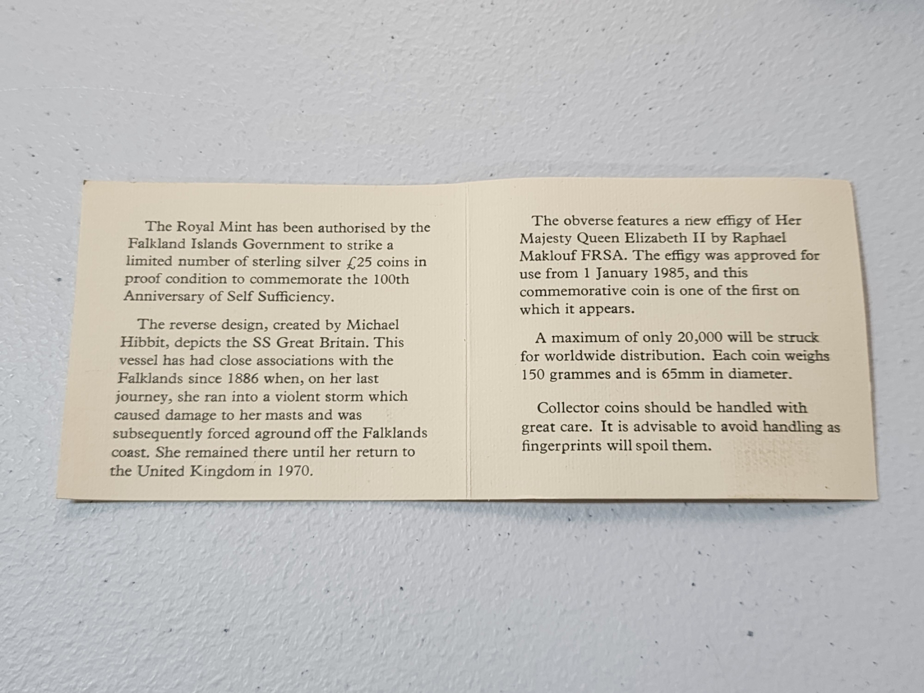 Falkland Island 100th Anniversary of Self Sufficiency Commemorative Sterling Silver $10 Proof Coin - 28g
