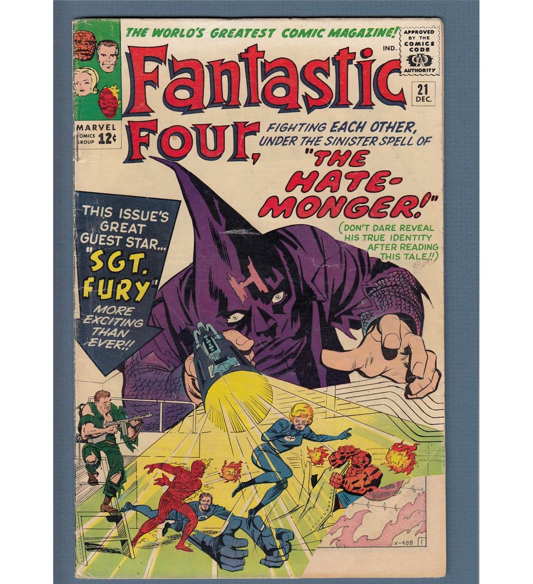 Fantastic Four #21(1963) intro. The Hate Monger, 1st Sgt. Fury crossover Stan Lee & Jack Kirby GD Comic