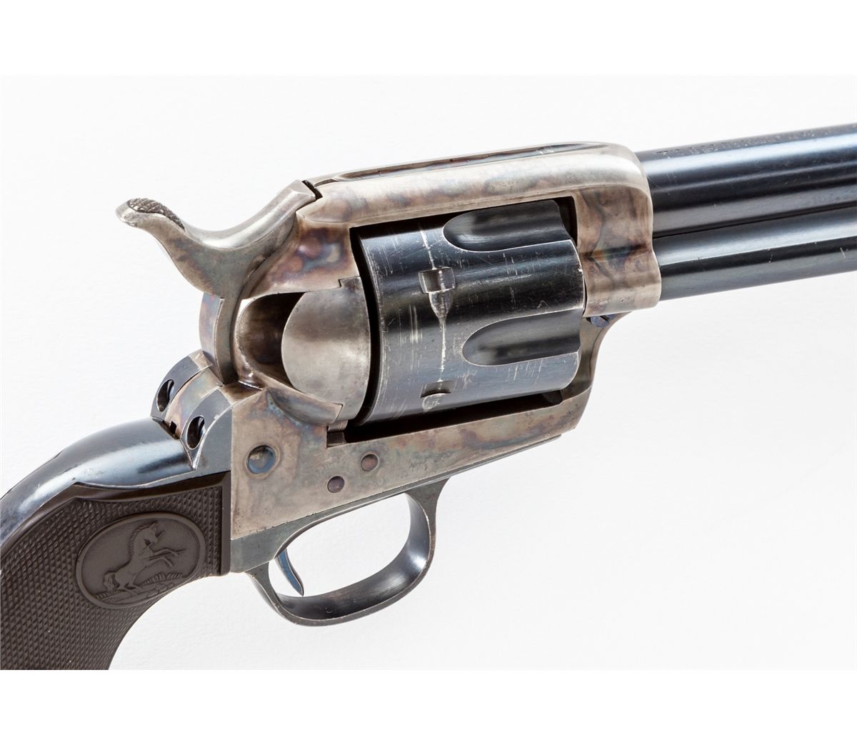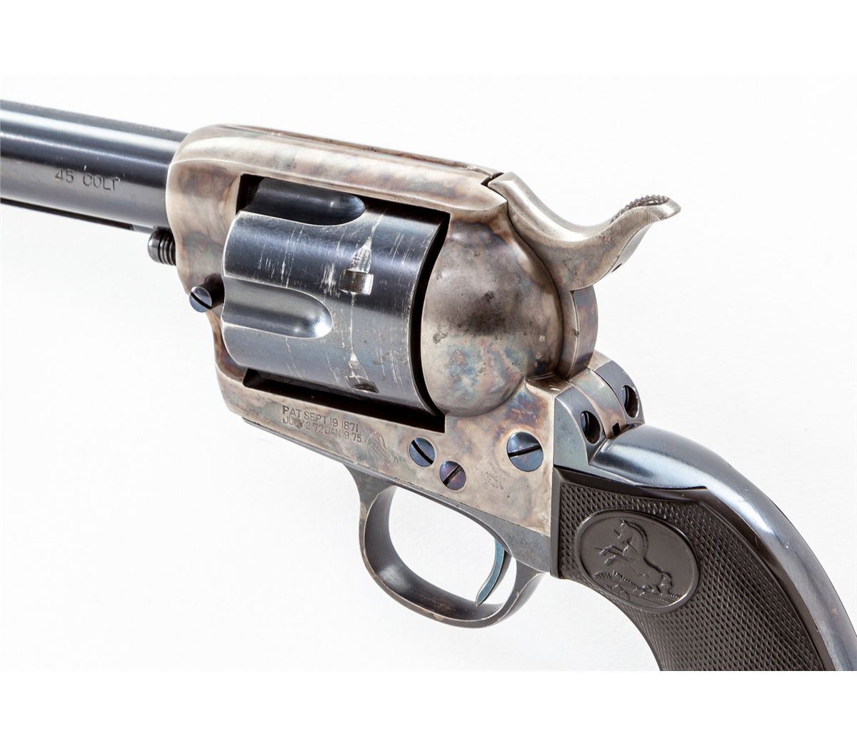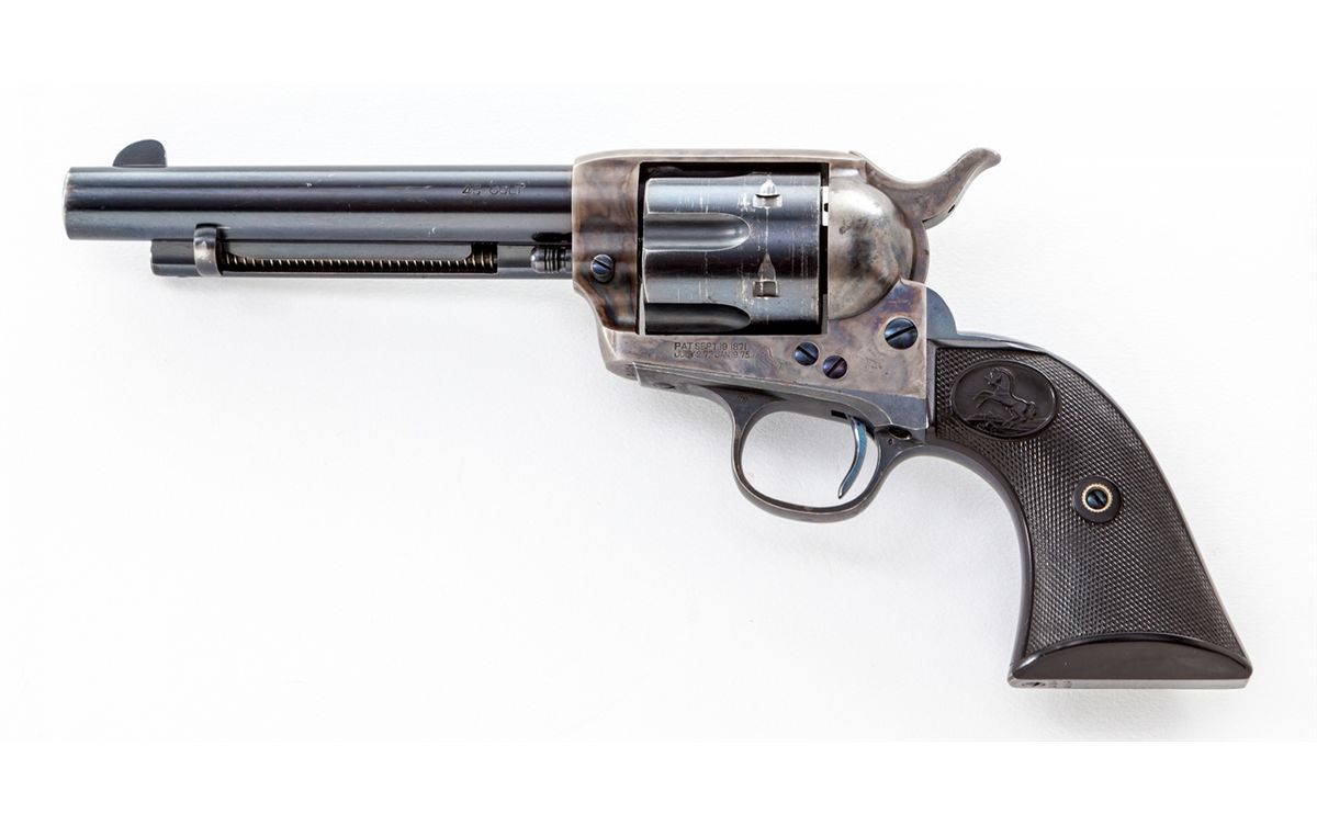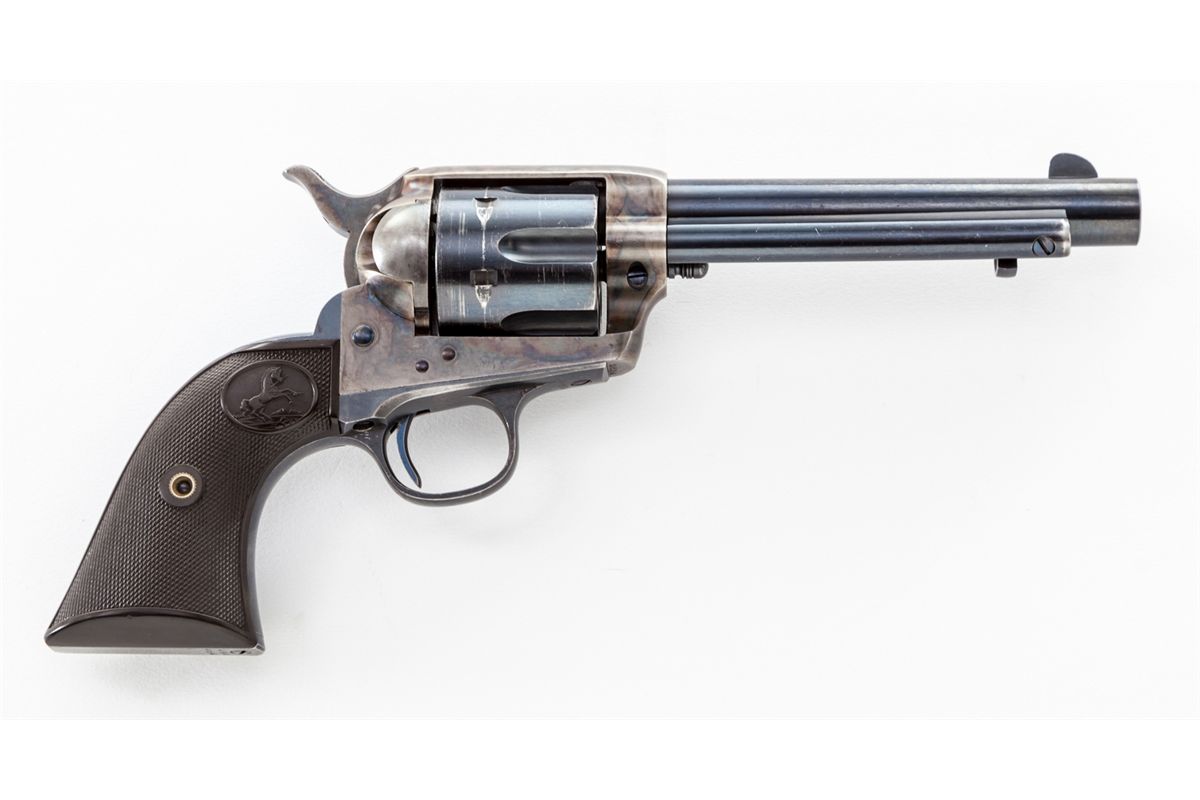 Fine Colt Single Action Army Revolver, #293354, .45 Colt cal., 5-1/2'' barrel, high-polish blue and case hardened finish, factory checkered hard rubber grips. Shipped to Walter Tips, Austin, Texas, May 3, 1907. Condition is excellent with light thinning at muzzle, cylinder, and high edges. Frame retains approx. 95%+ original vivid case hues. Fire blued screws are excellent retaining almost all of their original finish with clean crisp slots. Grips show only the lightest wear from handling. Action is crisp, bore is mirror bright. Est.: $9,500-$12,500. (C&R)