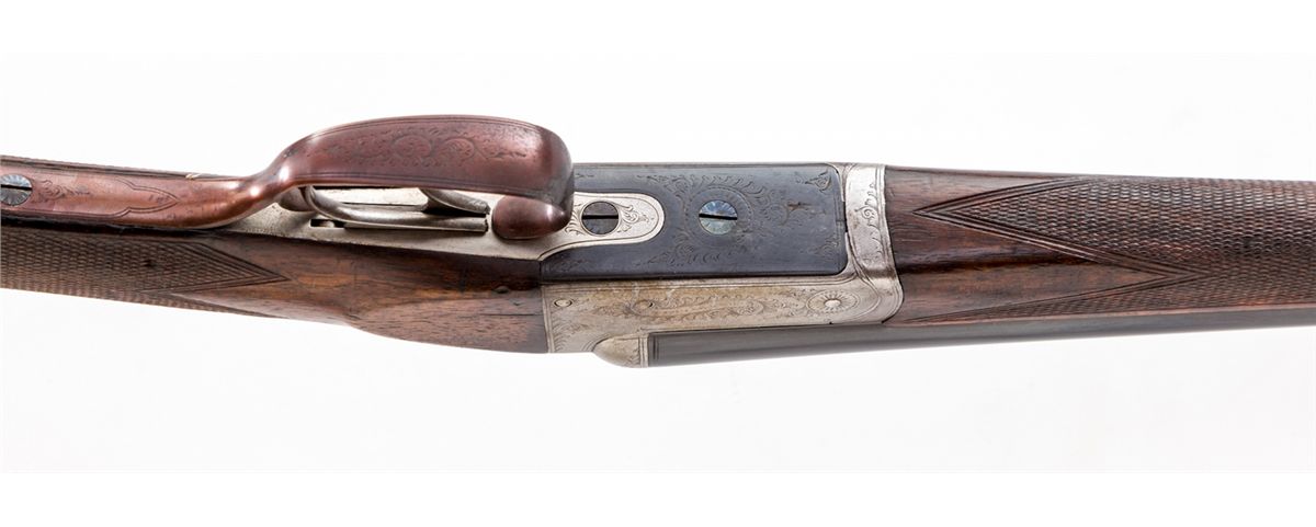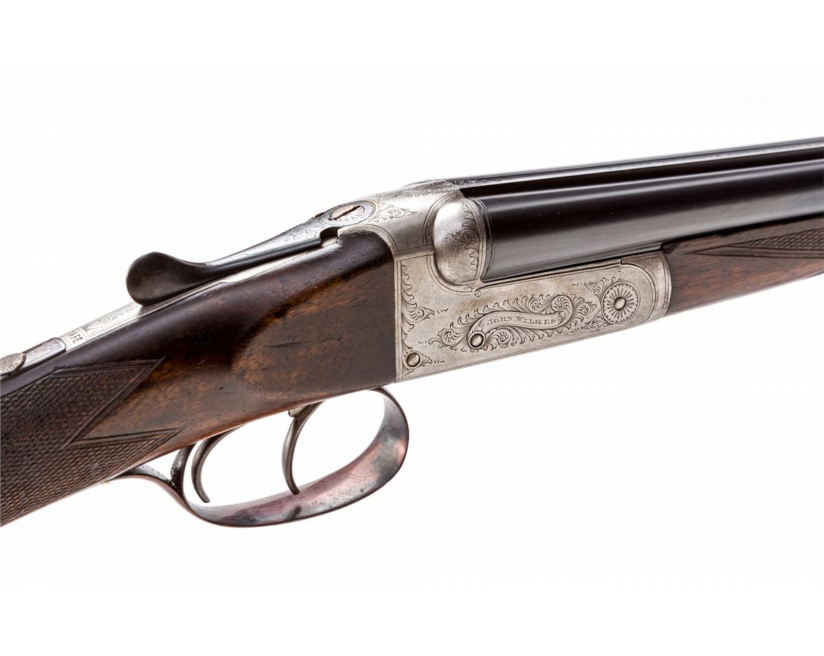 Fine English Side-by-Side Shotgun, by John Wilkes, #10128, .410 ga., 26'' blue barrels choked Full/Imp., with single steel bead; lightly engraved boxlock frame, auto safety, extractors, and dual triggers; nitro-proofed barrels with 3'' chamber depth; top of barrel marked ''John Wilkes, 79 Beak Street, Regent Street, London W1''; straight grain checkered walnut stock with splinter forend, and factory grooved walnut butt. Condition is very good to near fine. Barrels retain approx. 98% of a later re-blackening. Frame has thinned and toned mostly silver. Refinished triggerguard is an even plum color. Checkers show mild flattening; stock with minor pressure dings. Action is crisp, bores are bright. Length of pull: 14-1/4''. Est.: $2,000-$3,000. (C&R) (Ernest A. Bryant III estate)