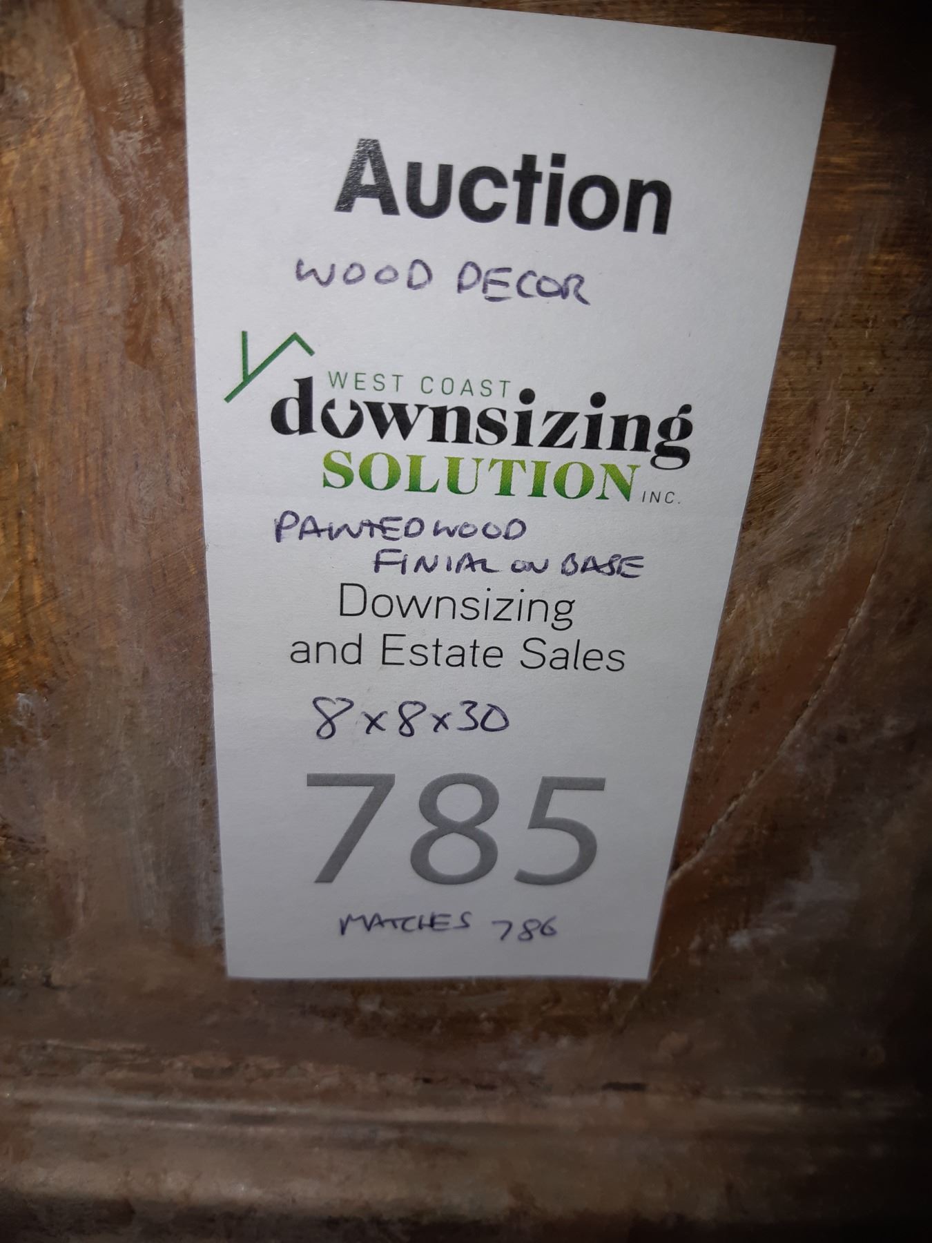 Painted wood finial on plinth 8x8x30. Pickup at 10 am