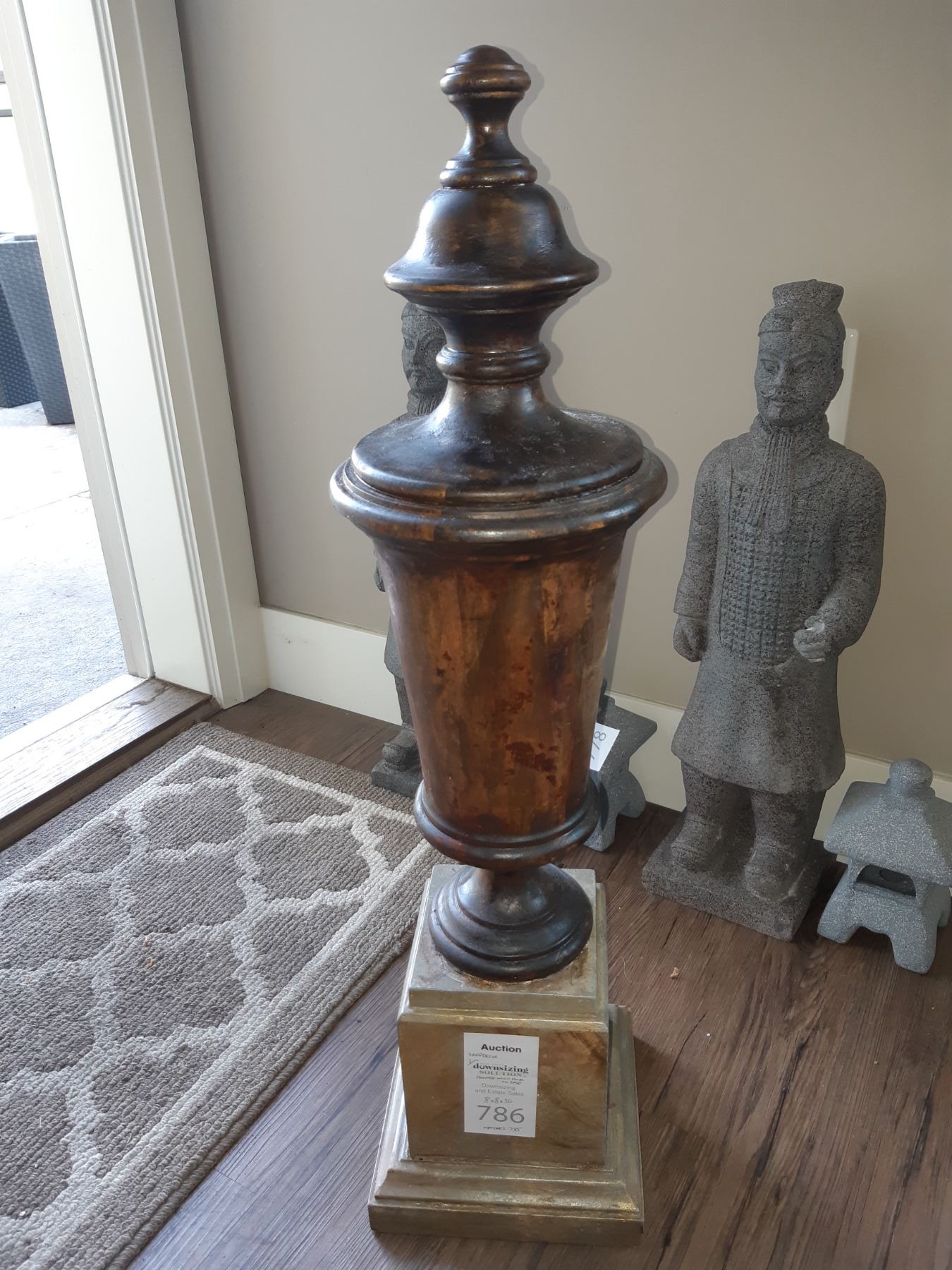 Painted wood finial on plinth 8x8x30. Pickup at 10 am