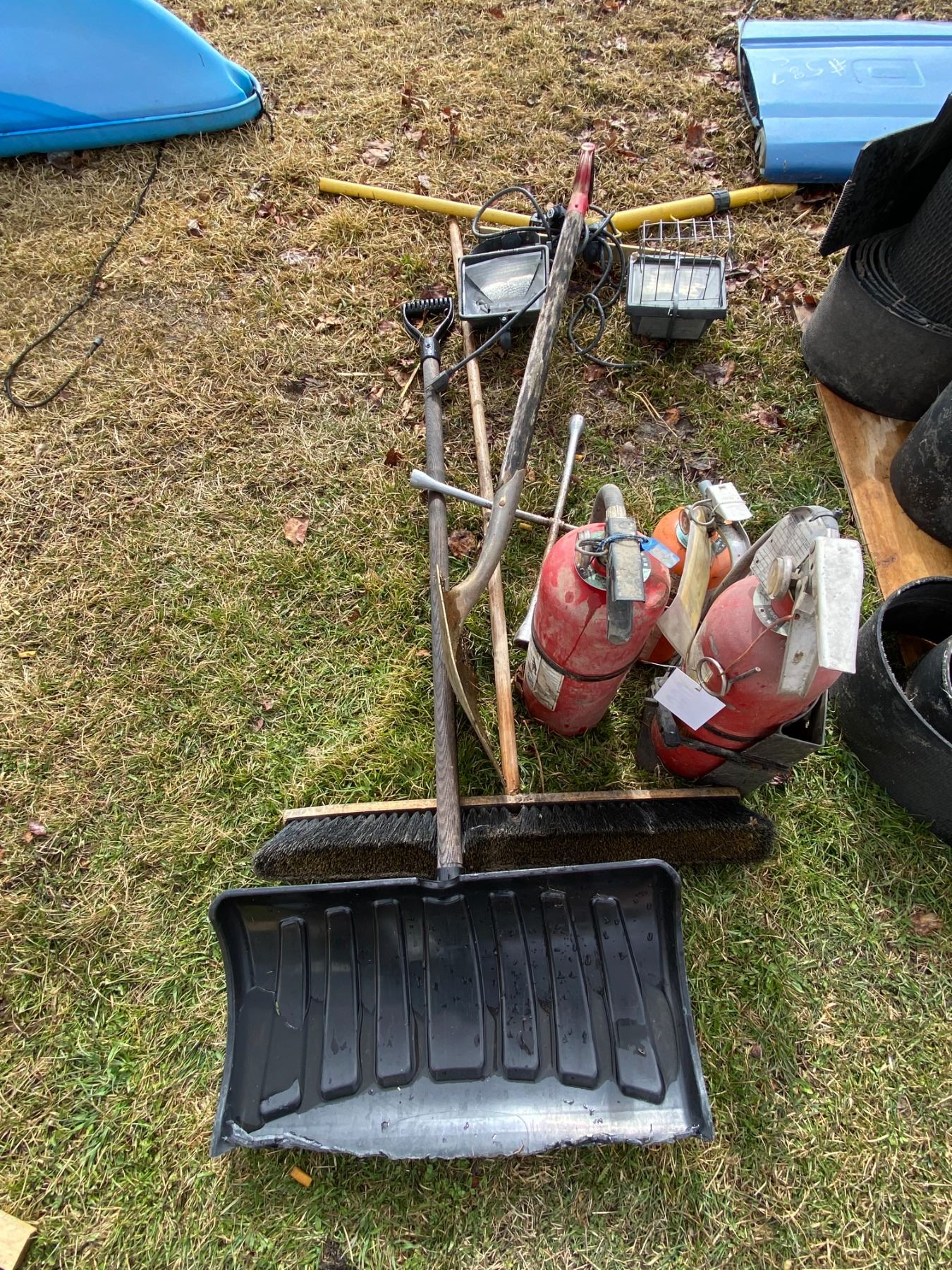 Fire ext., snow shovel, broom, light