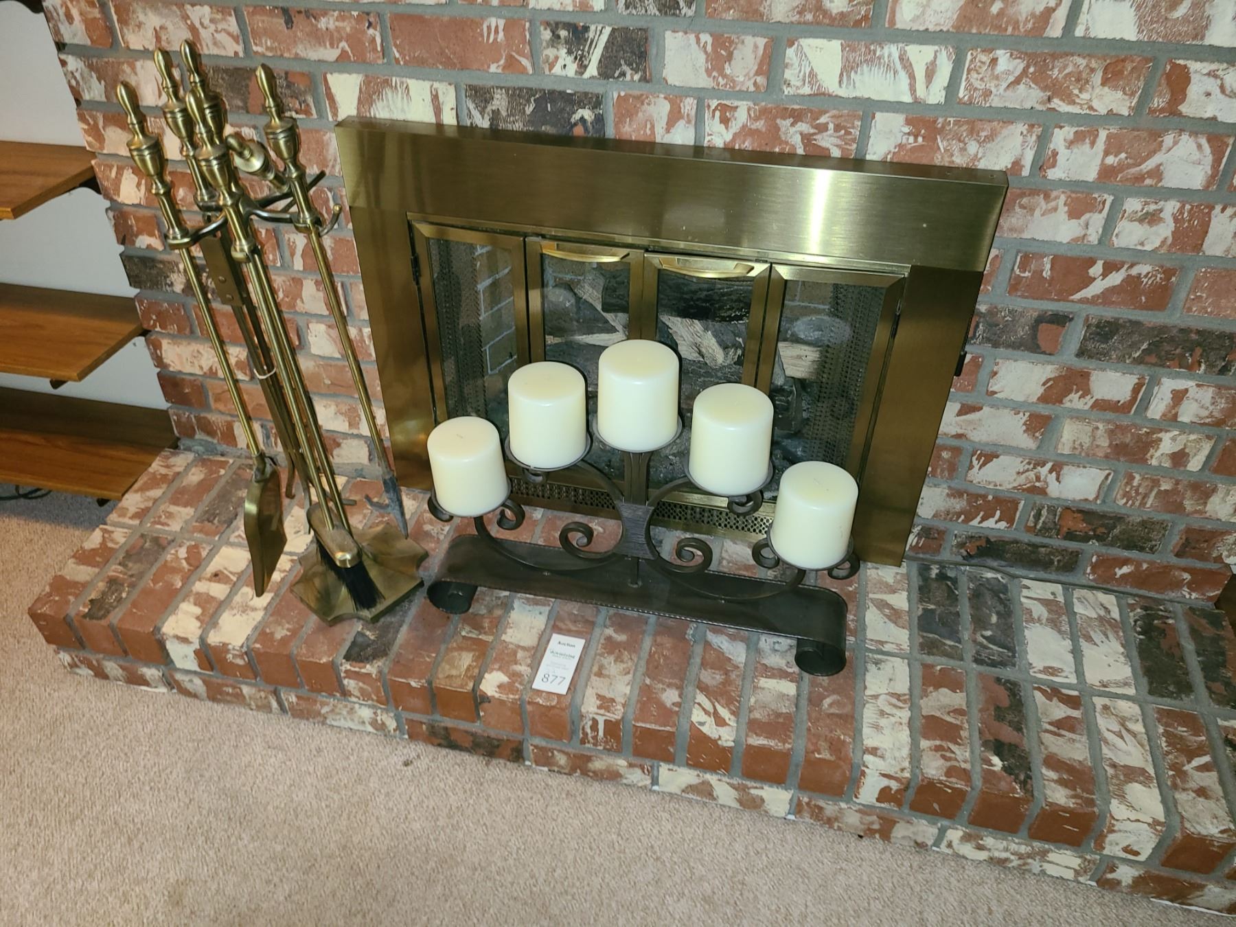 Fireplace tools, candles on metal holder. Pickup 9 am