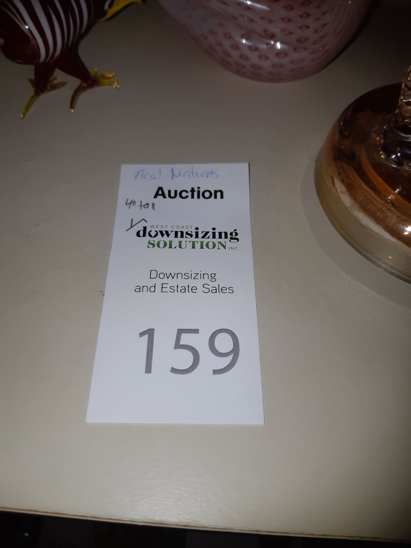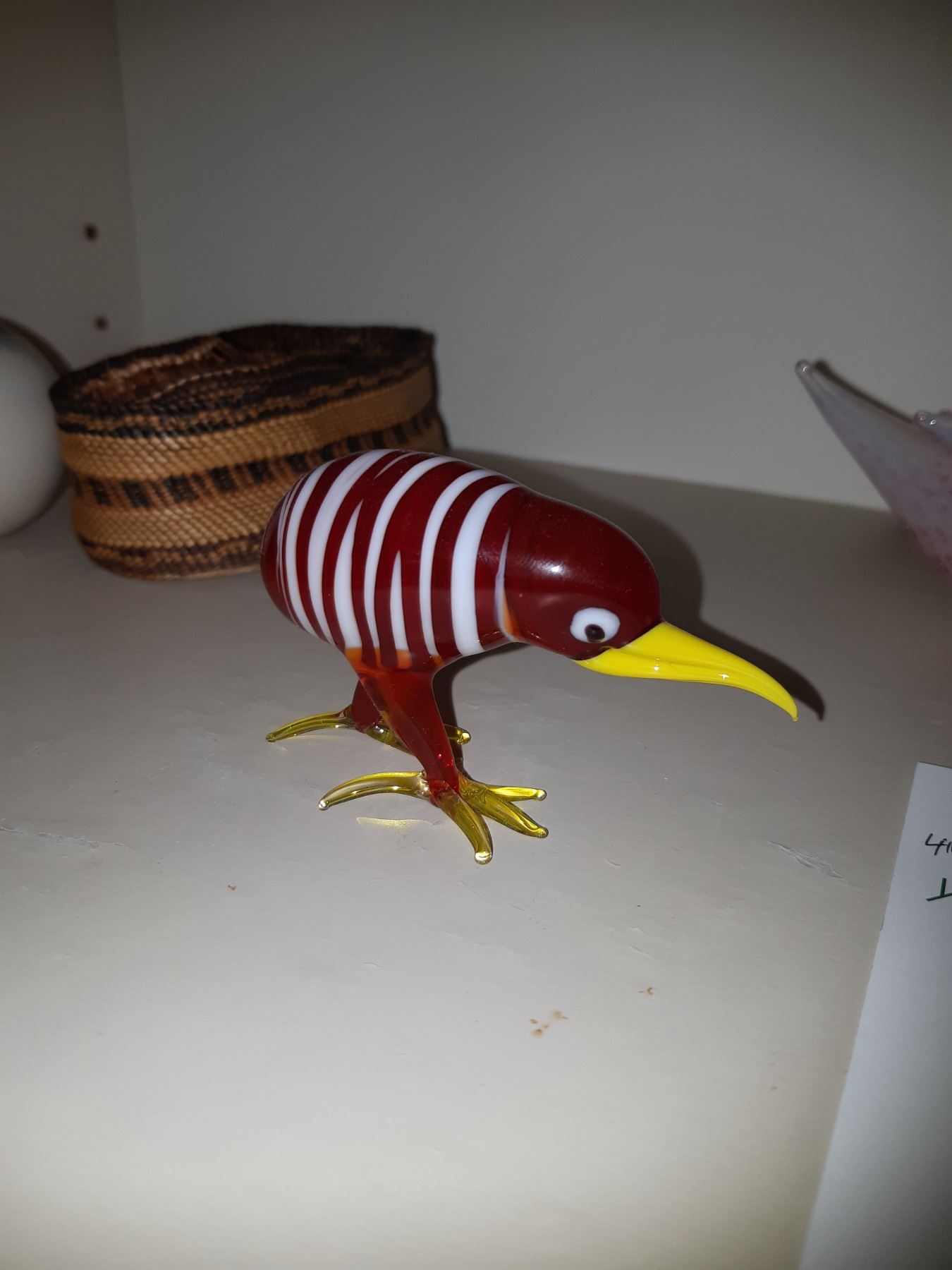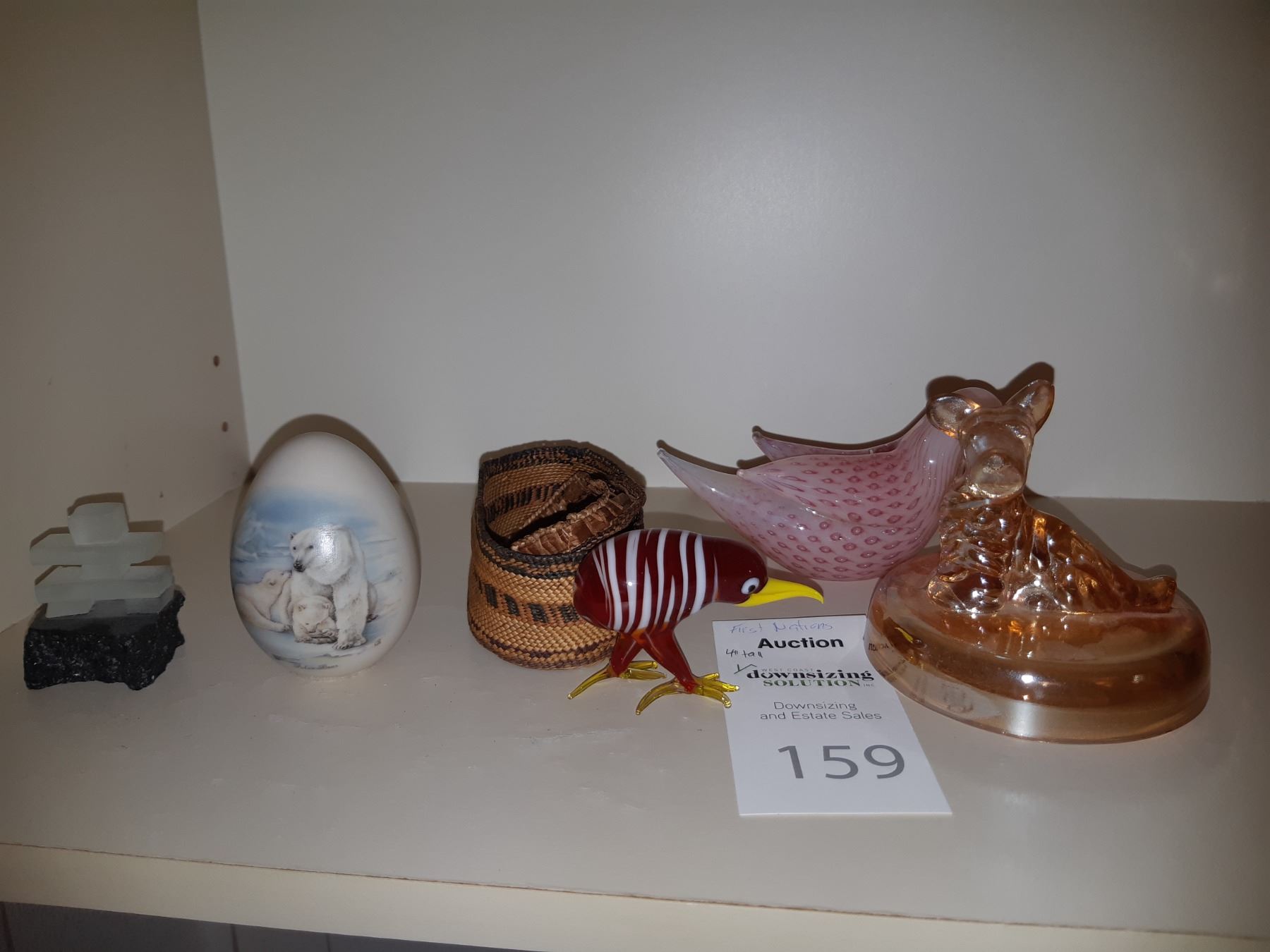 First Nations miniature oval lidded basket, about 4" wider 1" high. Note some repair needed on the lid trim. Pink & white glass bird, glass kiwi, stone egg with polar bears painting. Bring packing and pickup at 9 am