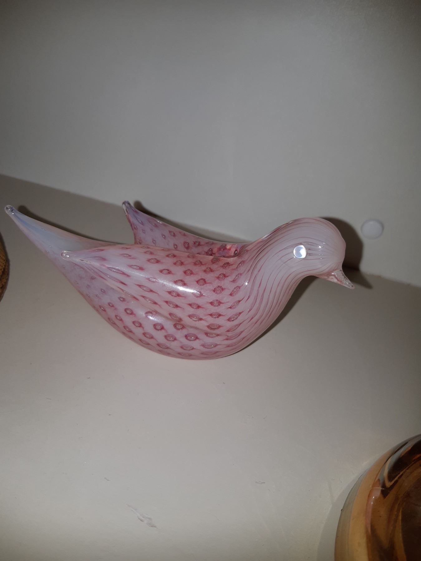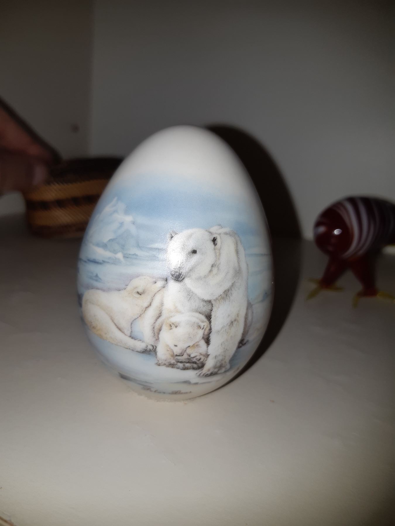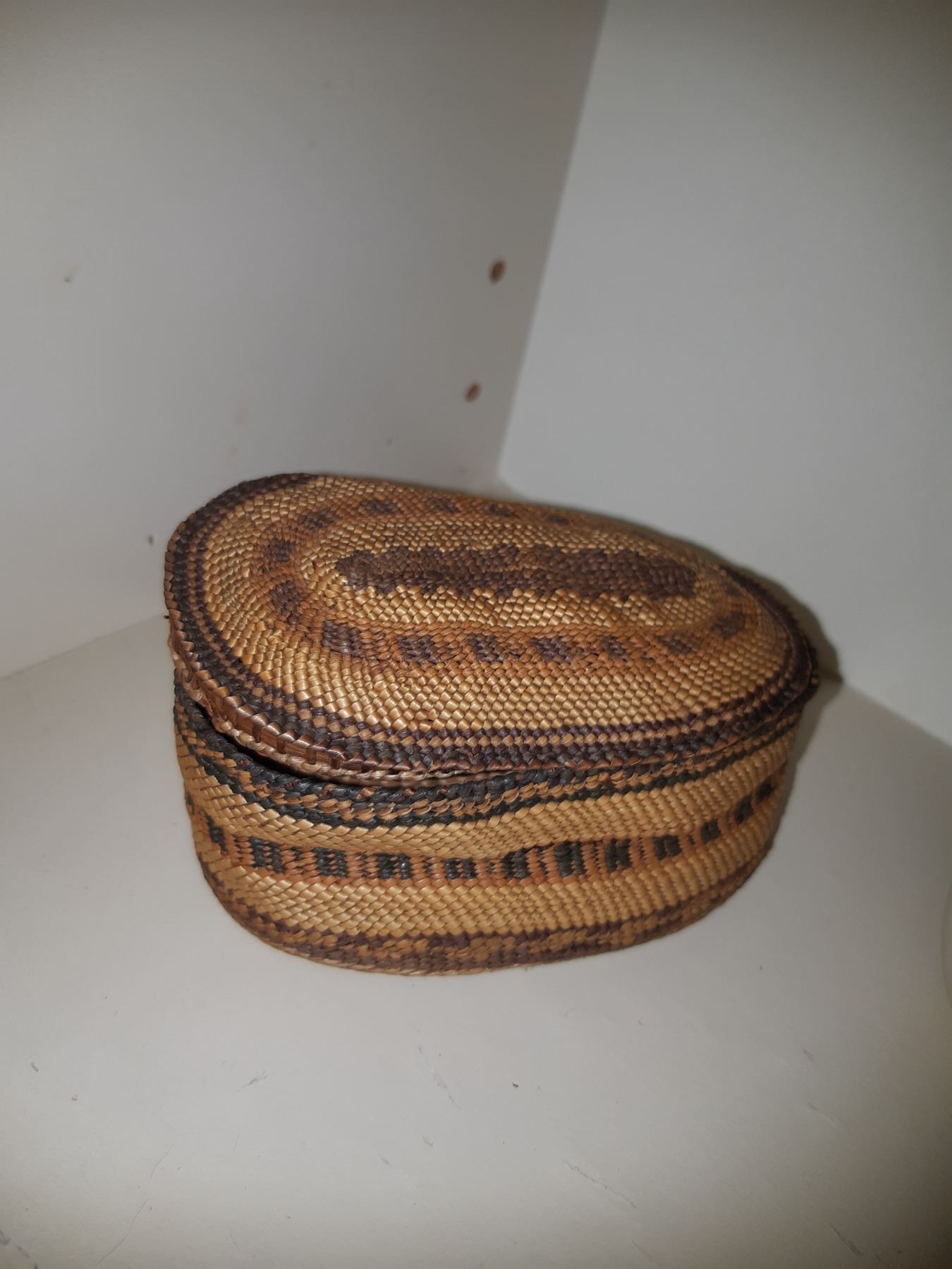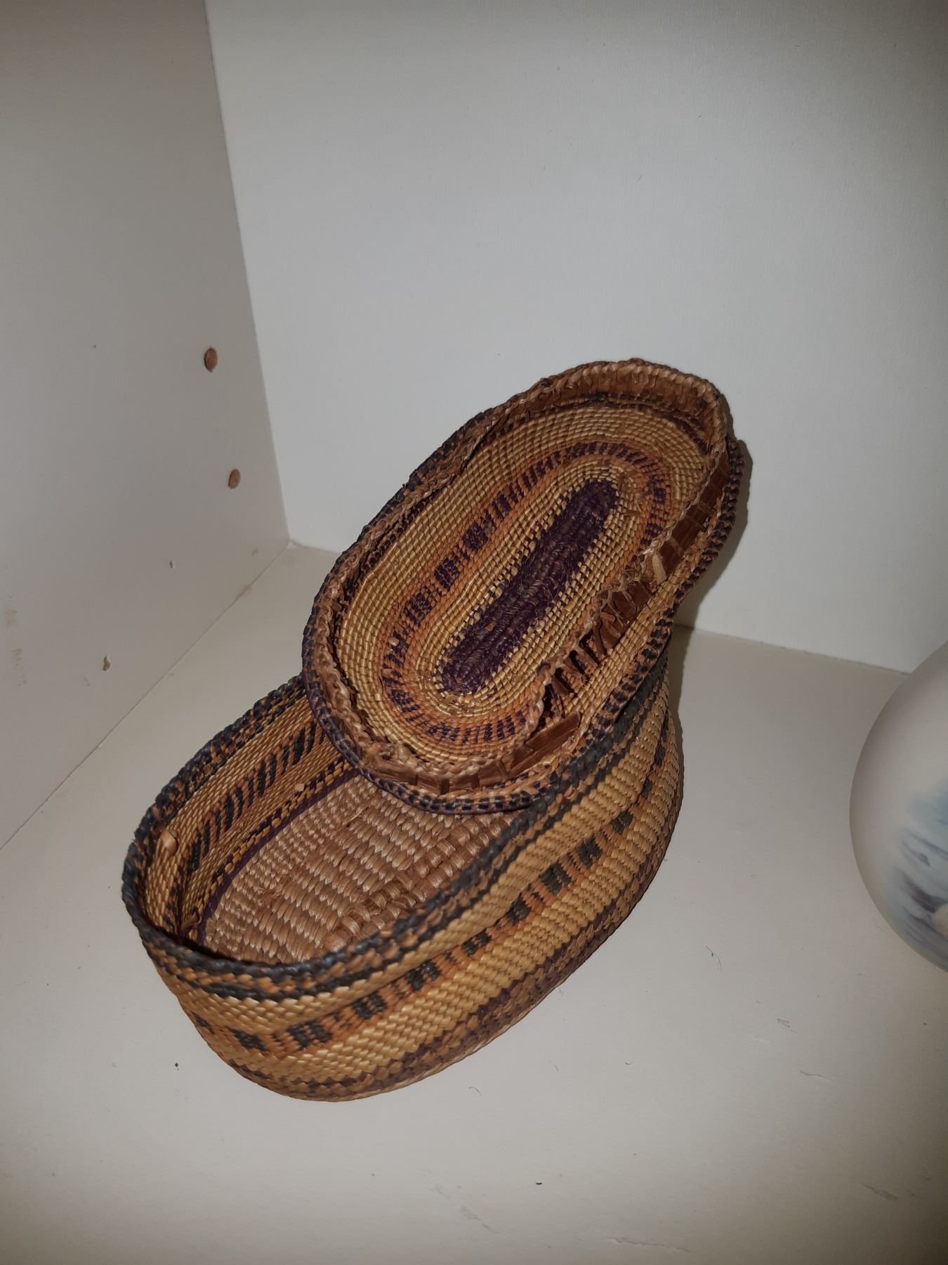 First Nations miniature oval lidded basket, about 4" wider 1" high. Note some repair needed on the lid trim. Pink & white glass bird, glass kiwi, stone egg with polar bears painting. Bring packing and pickup at 9 am