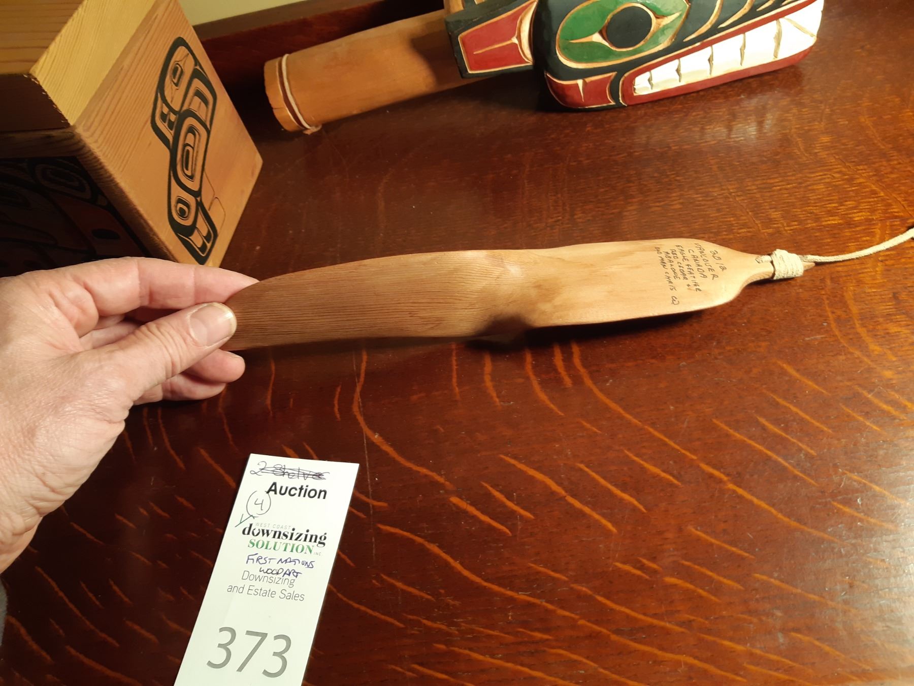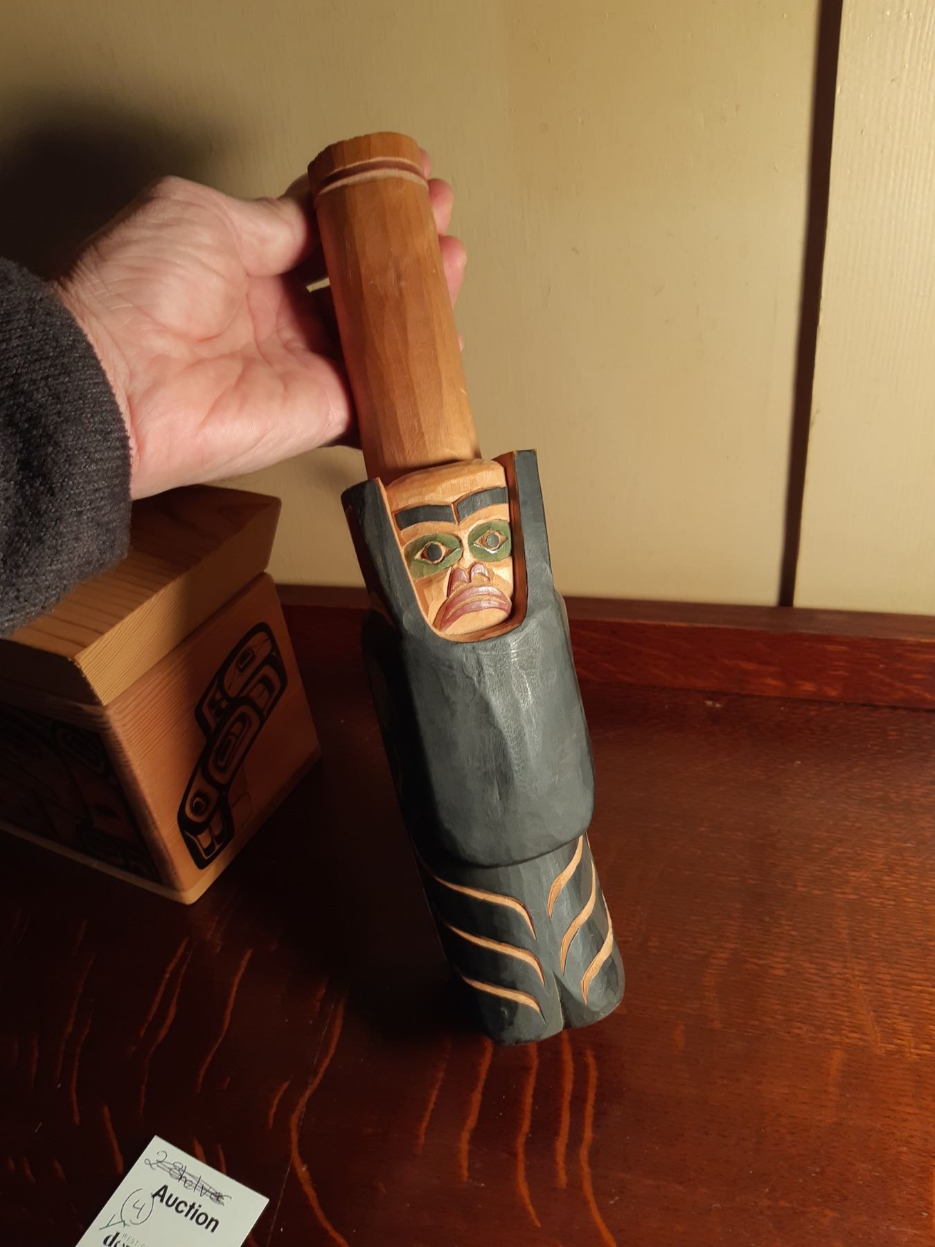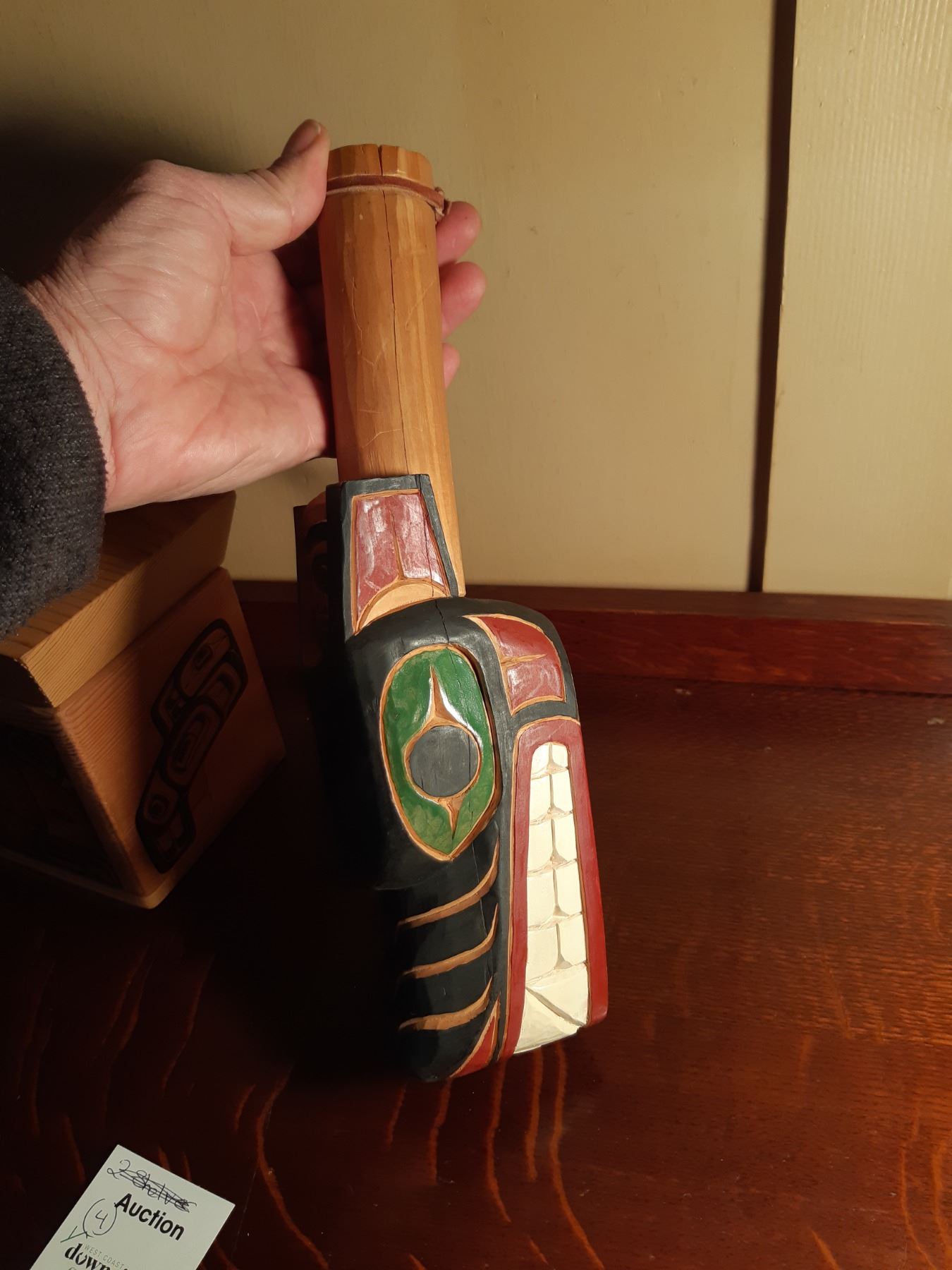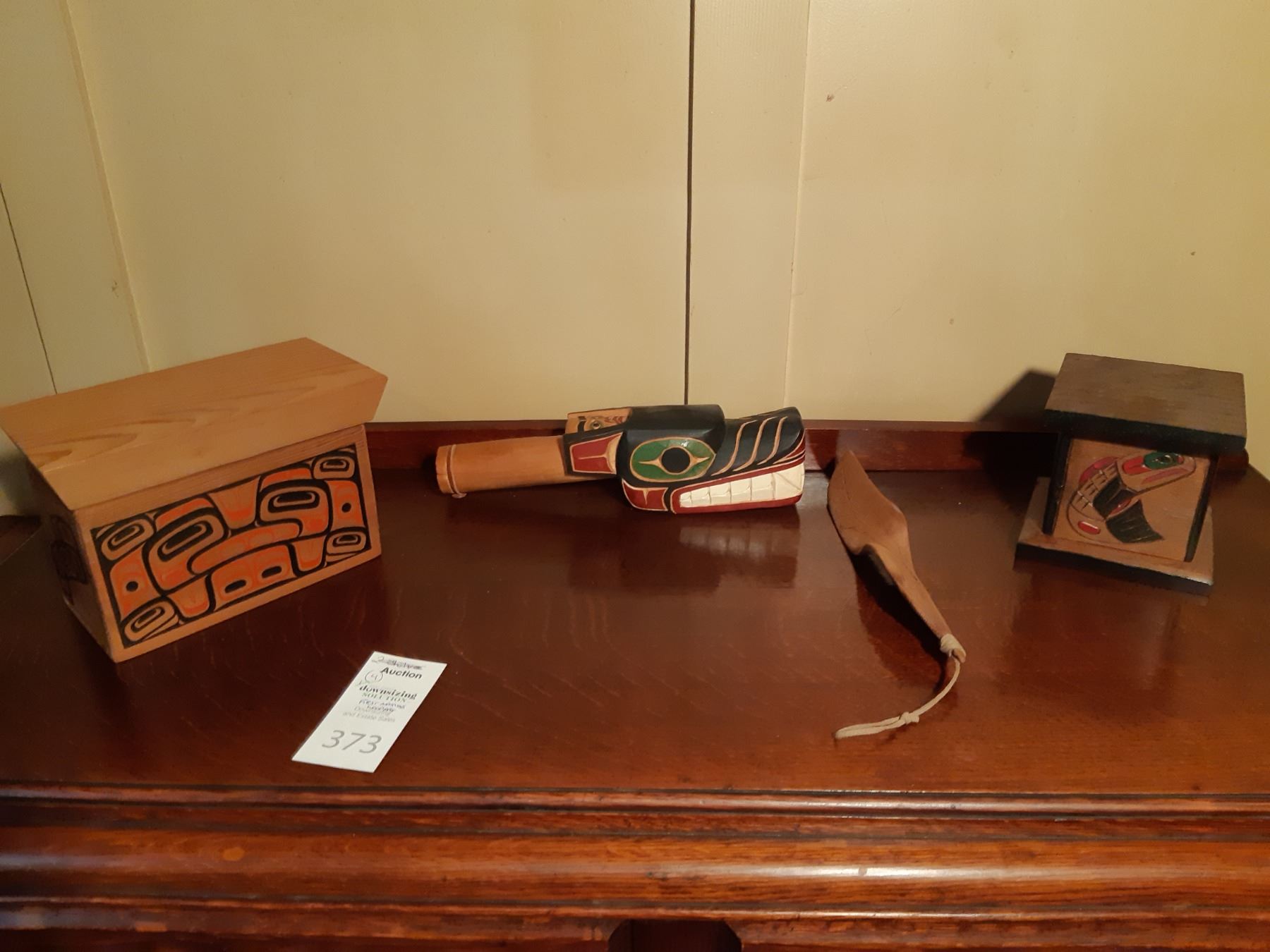 Rattle, 2 Carved lidded containers. Pickup at 9 am